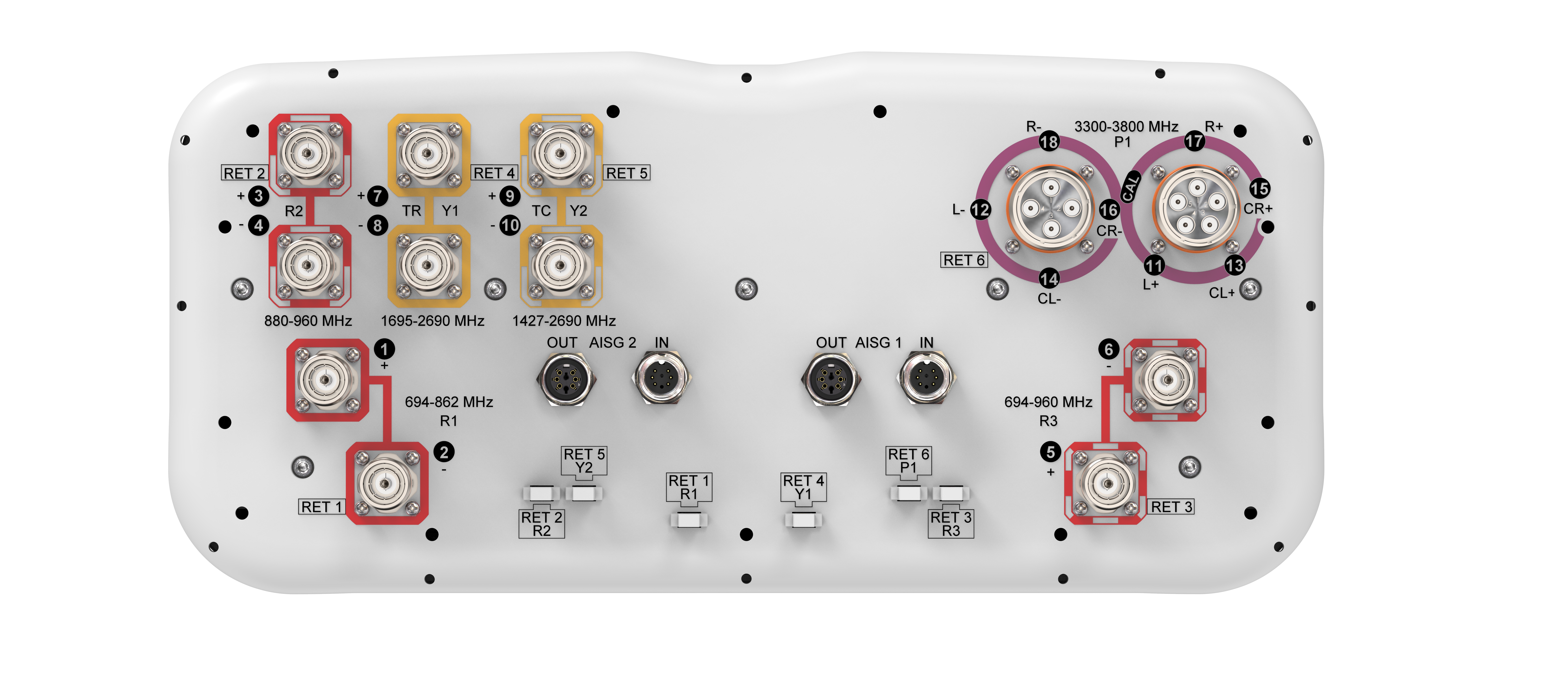 18-port sector antenna, 2x 694-862 (R1), 2x 880-960 (R2), 2x 694- 960 (R3), 2x 1427-2690 (Y2) & 2x 1695-2690 (Y1) MHz, 65° HPBW and 8x 3300-3800 (P1) MHz, 90° HPBW, 6x RET.