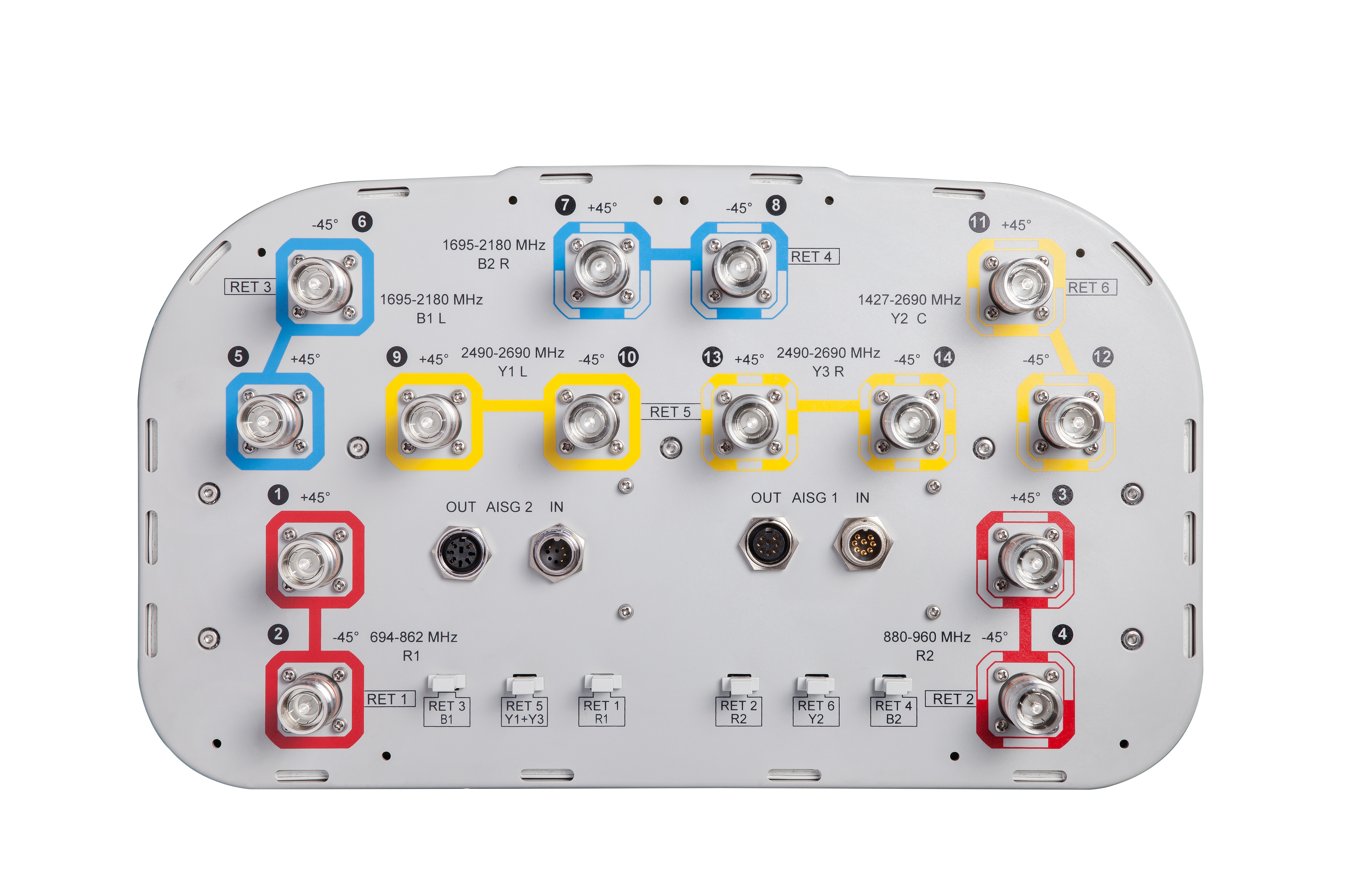 14-port sector antenna, 2x 694-862 (R1), 2x 880-960 (R2), 2x 1427-2690 (Y2), 4x 1695-2180 (B1-B2), 4x 2490-2690 (Y1 & Y3) MHz, 65° HPBW, 6x RET. Y1 & Y3 share a common RET