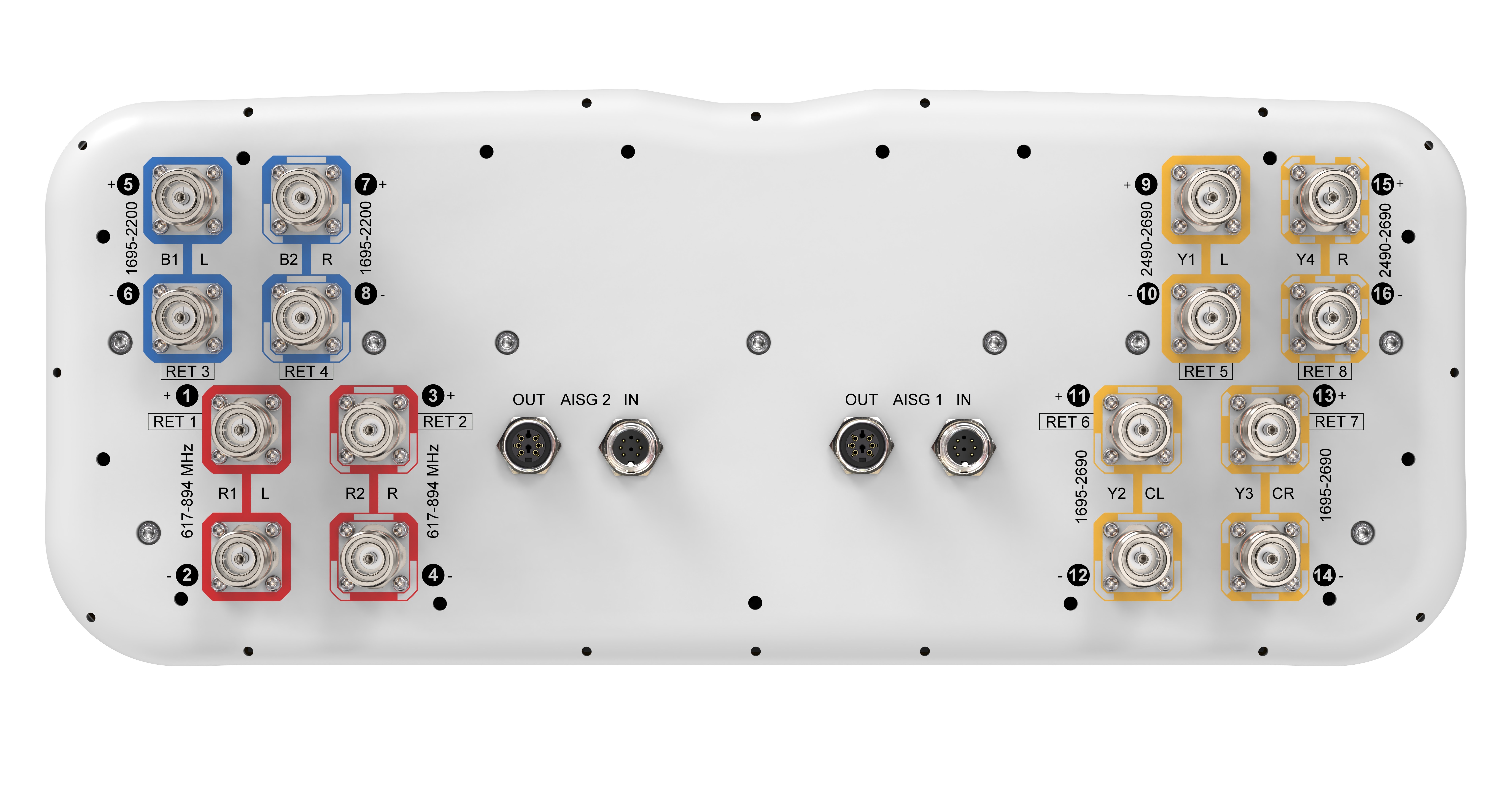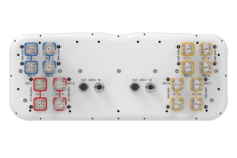 16-port sector antenna, 4x 617-894, 4x1695-2200, 4x2490-2690 and 4x1695-2690 MHz, 65° HPBW, 8x RET