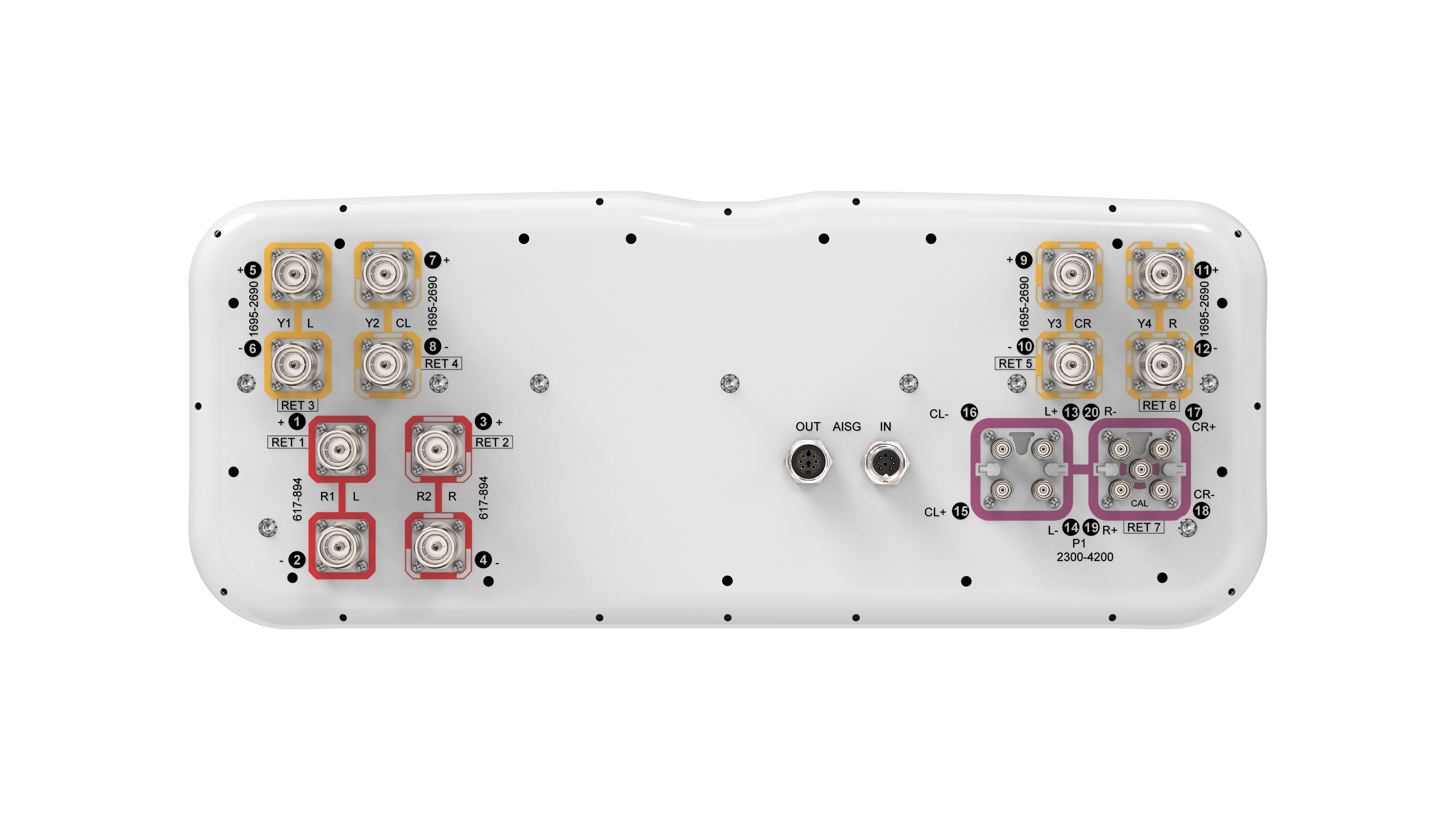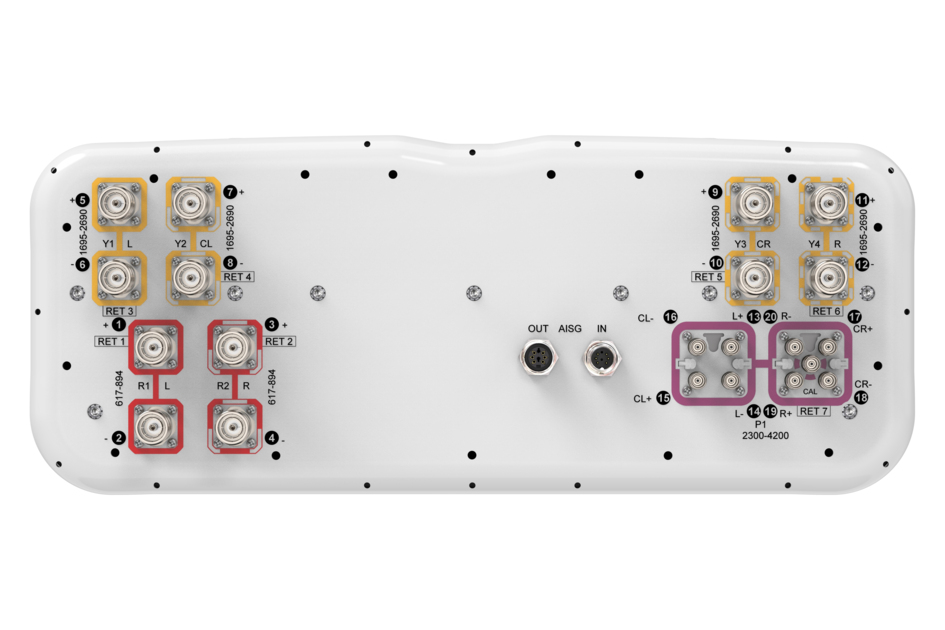 20-port sector antenna, 4x 617-894, 8x 1695-2690 MHz 65° HPBW and 8x 2300-4200 MHz, Beamformer, 7x RET