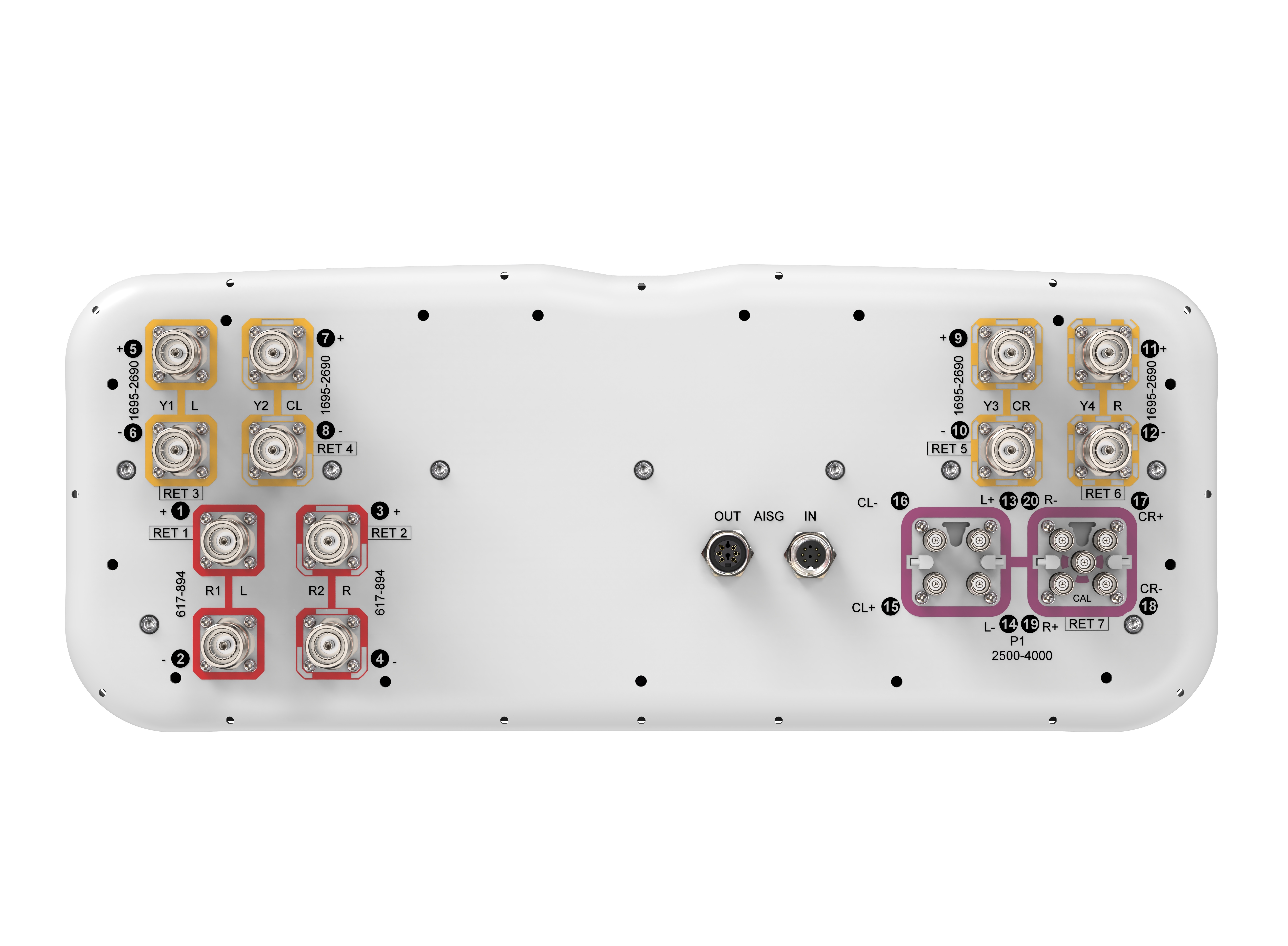 20-port sector antenna, 4x 617-894, 8x 1695-2690 MHz 65° HPBW and 8x 2500-4000 MHz, Beamformer, 7x RET