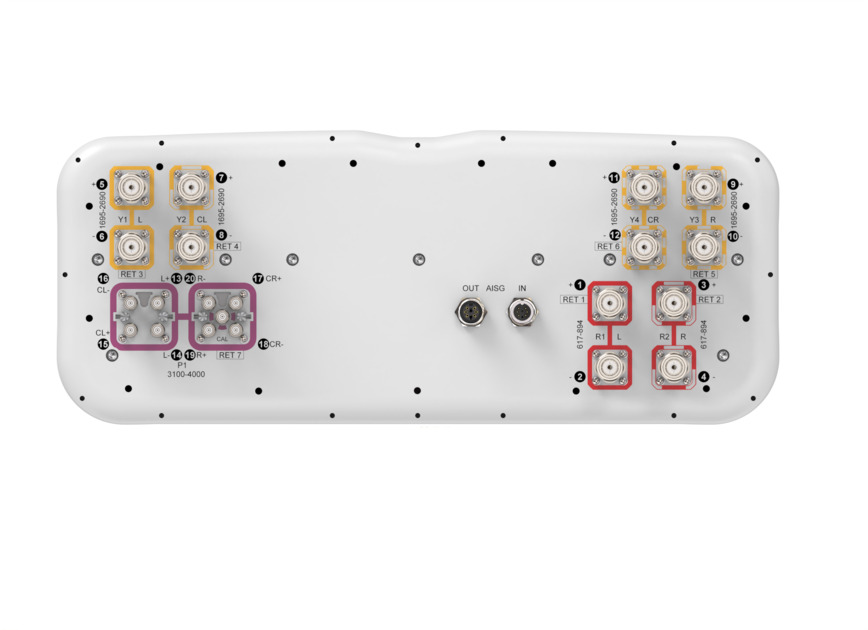 20-port sector antenna, 4x 617-894, 8x 1695-2690 MHz 65° HPBW and 8x 3100-4000 MHz, Beamformer, 7x RET