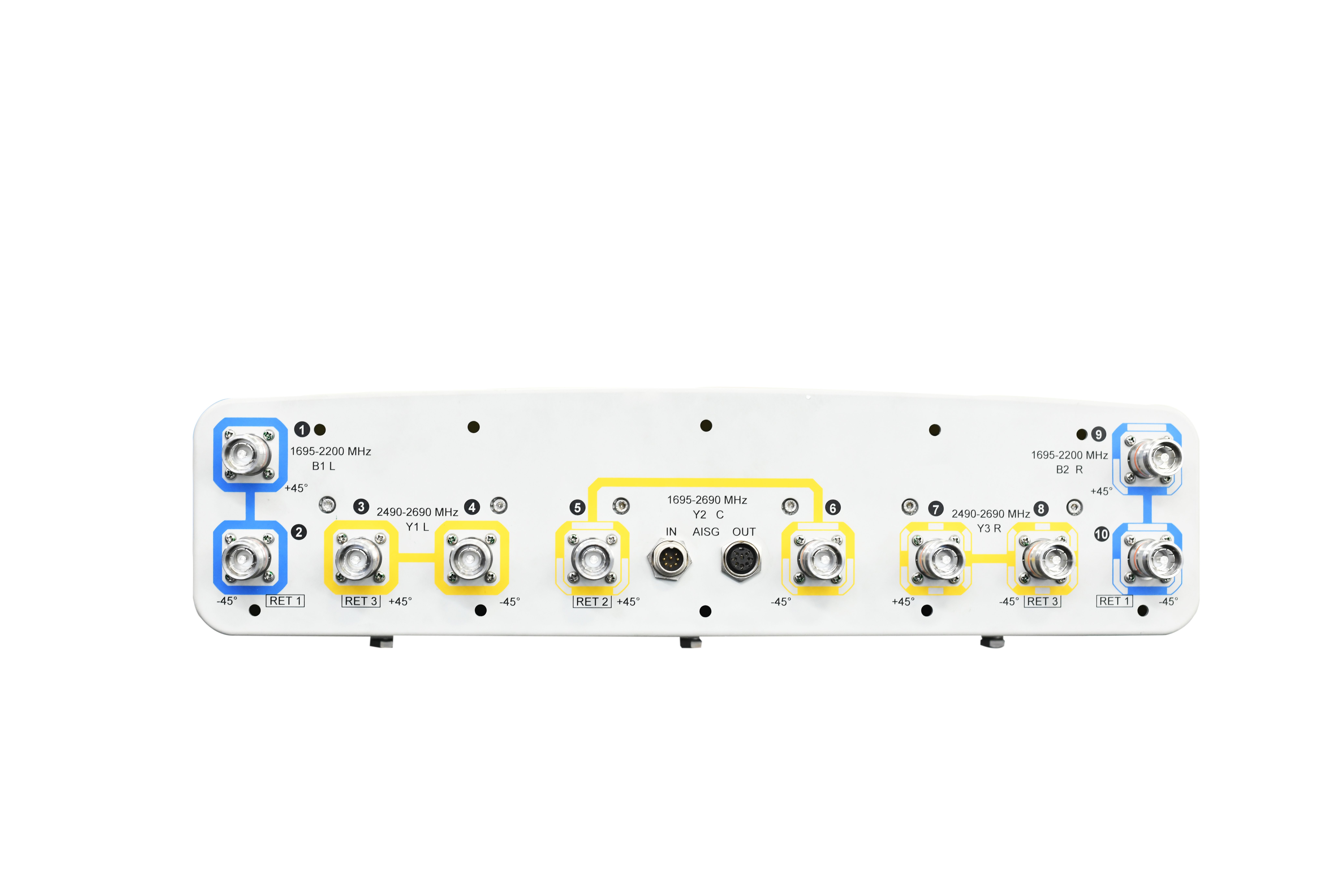 10-Port Antenna, 4x 1695–2200 (HB1), 4x 2490-2690 (HB2) and 2x 1695-2690 (HB3) MHz, 65° horizontal beamwidth, 3x Internal RET