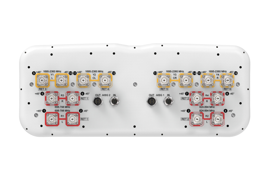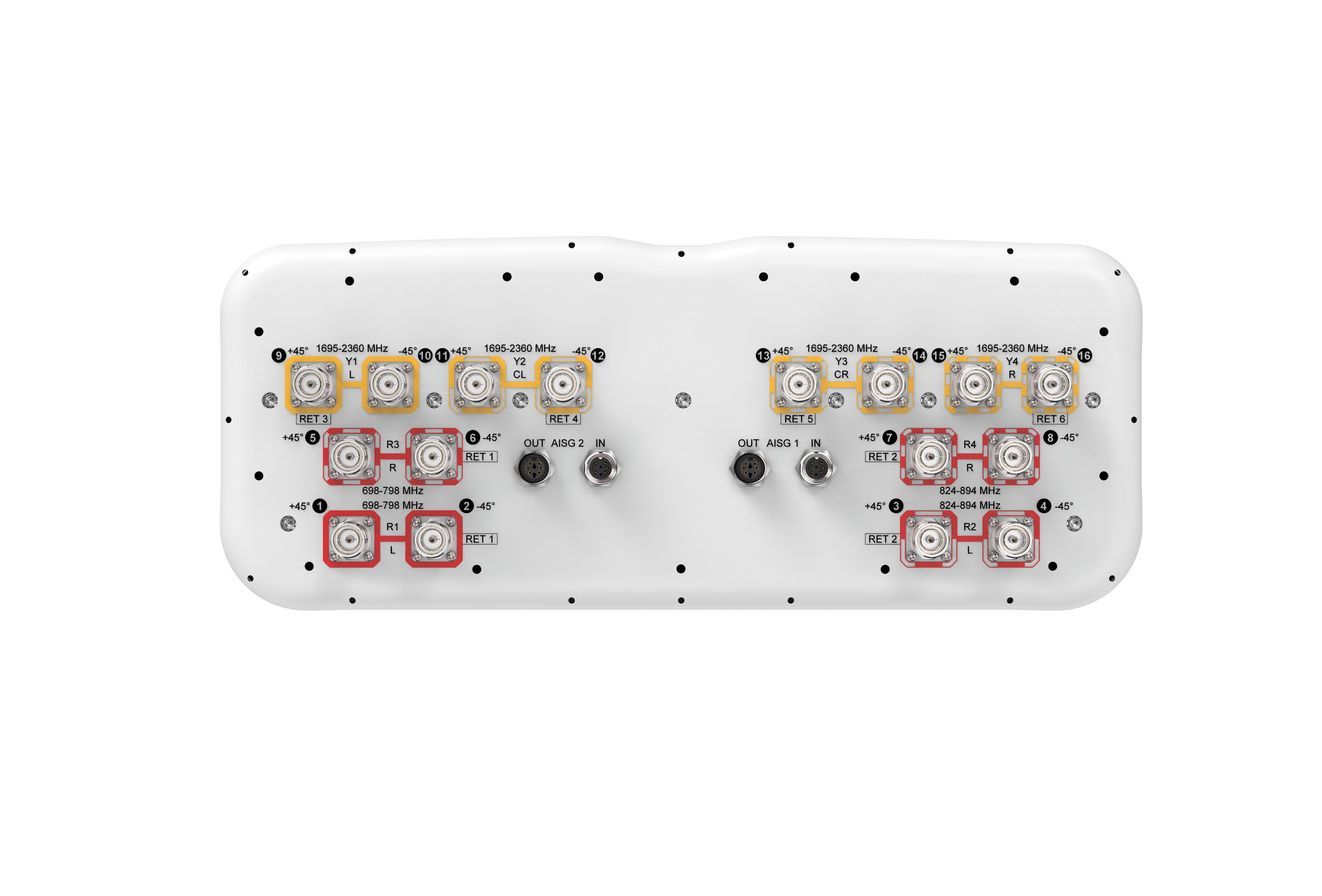 16-port, low band diplexed antenna, 4 x 698-798 MHz, 4 x 824-894 MHz and 8 x 1695-2360 MHz, 65° HPBW, 6 x RET