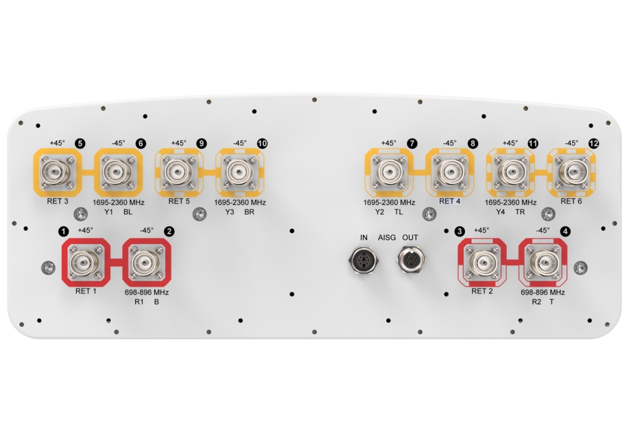 12-port sector antenna, 4x 698–896 and 8x 1695–2360 MHz, 45° HPBW, 6x RET