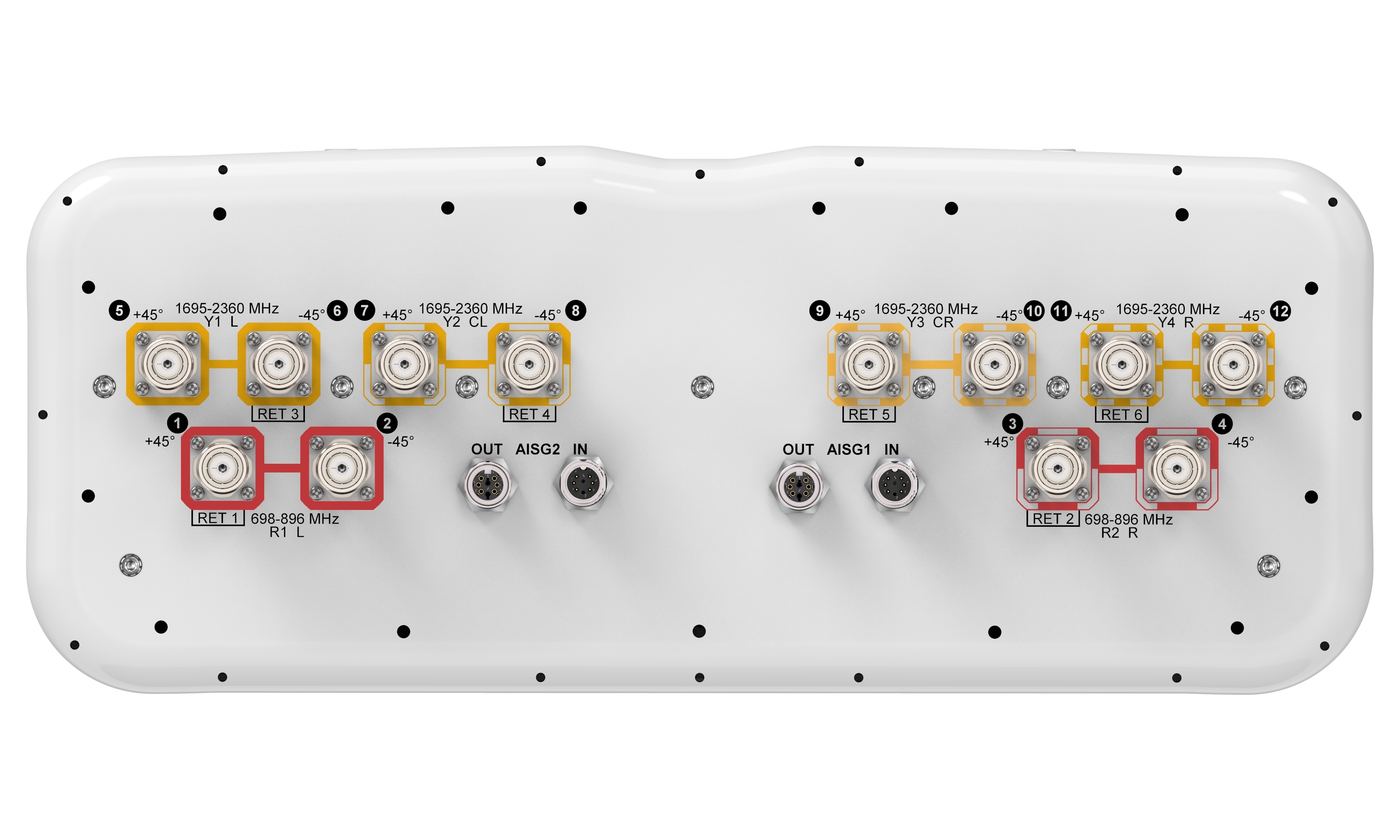 - Features broadband Low Band (698-896 MHz) and High Band (1695-2360 MHz) arrays for 4T4R (4X MIMO) capability for Band 14, AWS, PCS and WCS applications