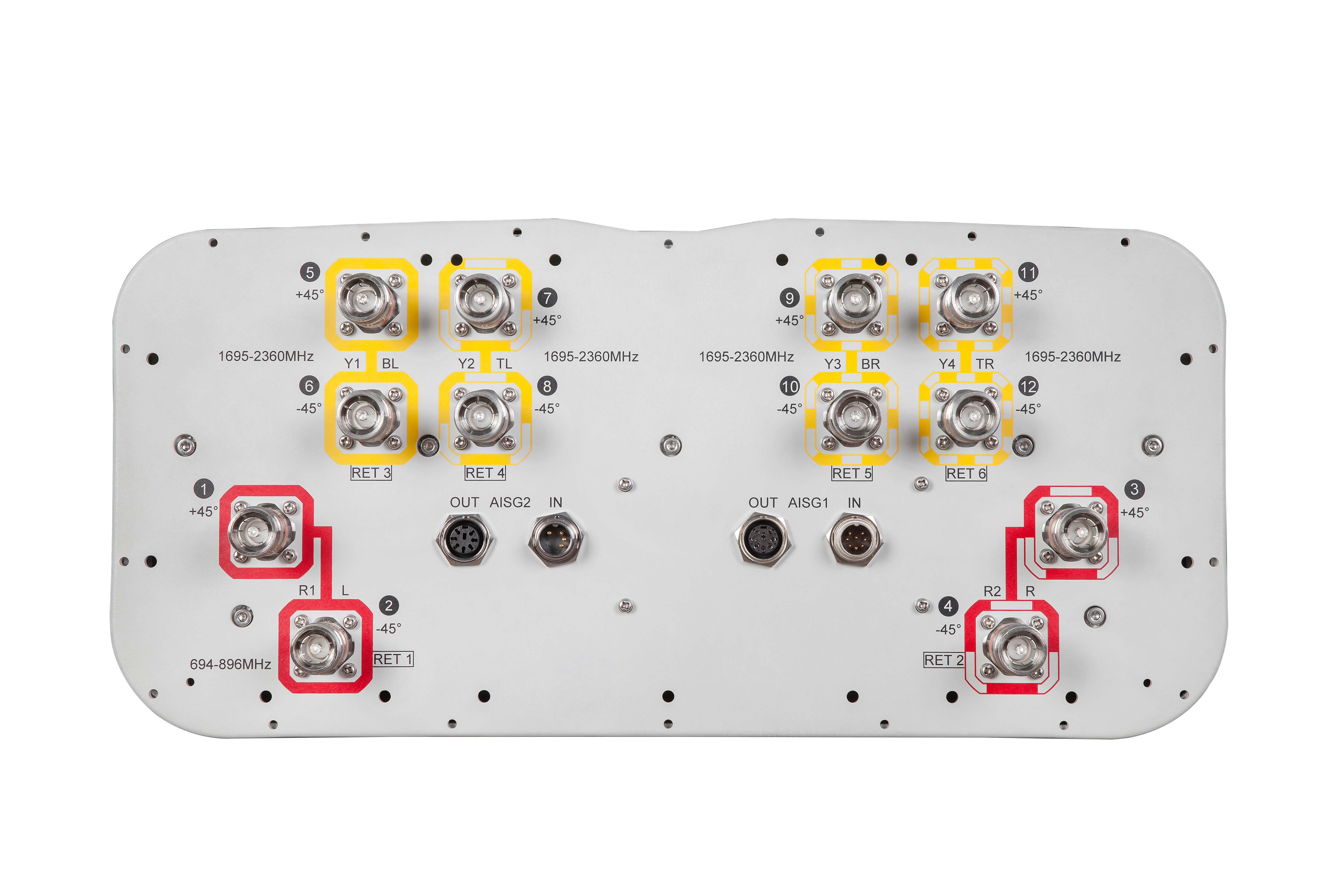 12-port sector antenna, 4x 698–896 and 8x 1695–2360 MHz, 65° HPBW, 6x RET.