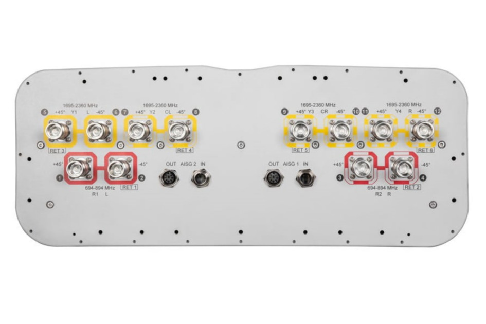 12-port sector antenna, 4x 694–894 and 8x 1695–2360 MHz, 85° HPBW, 6x RETs
