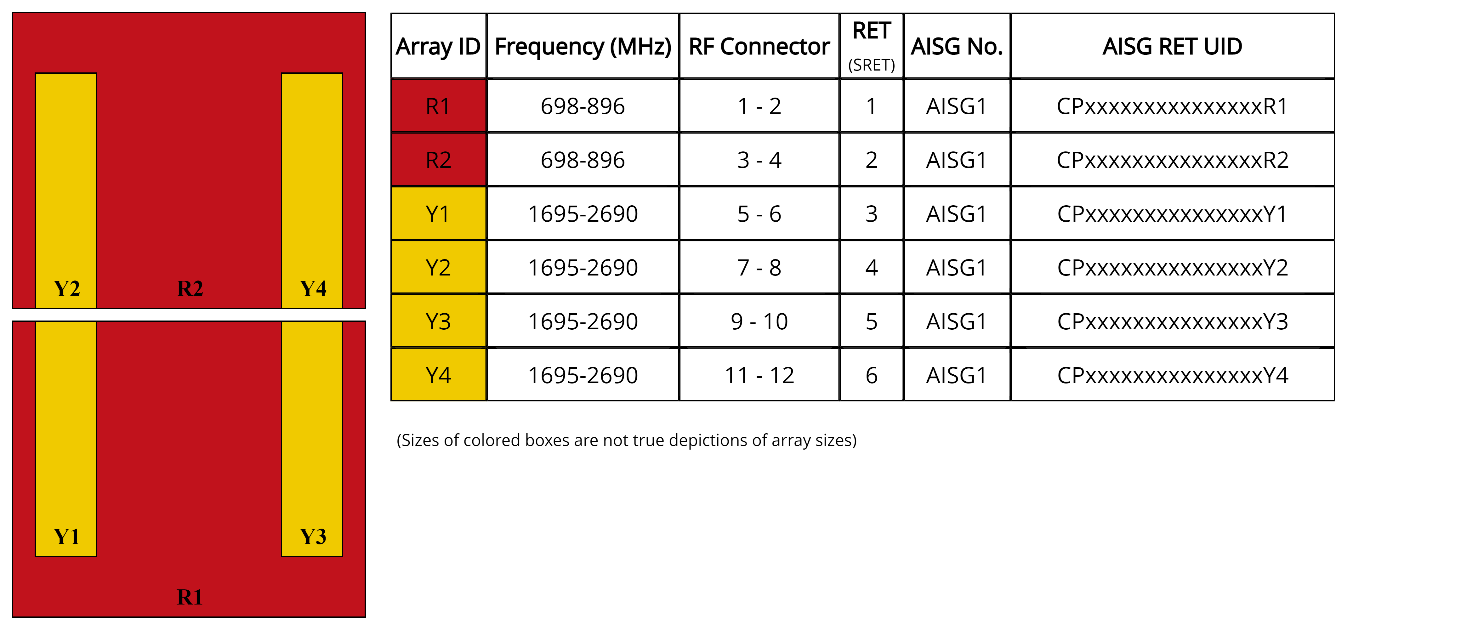 - Array configuration provides capability for 4T4R (4x MIMO) on Low band and Dual 4T4R (4x MIMO) on Mid band