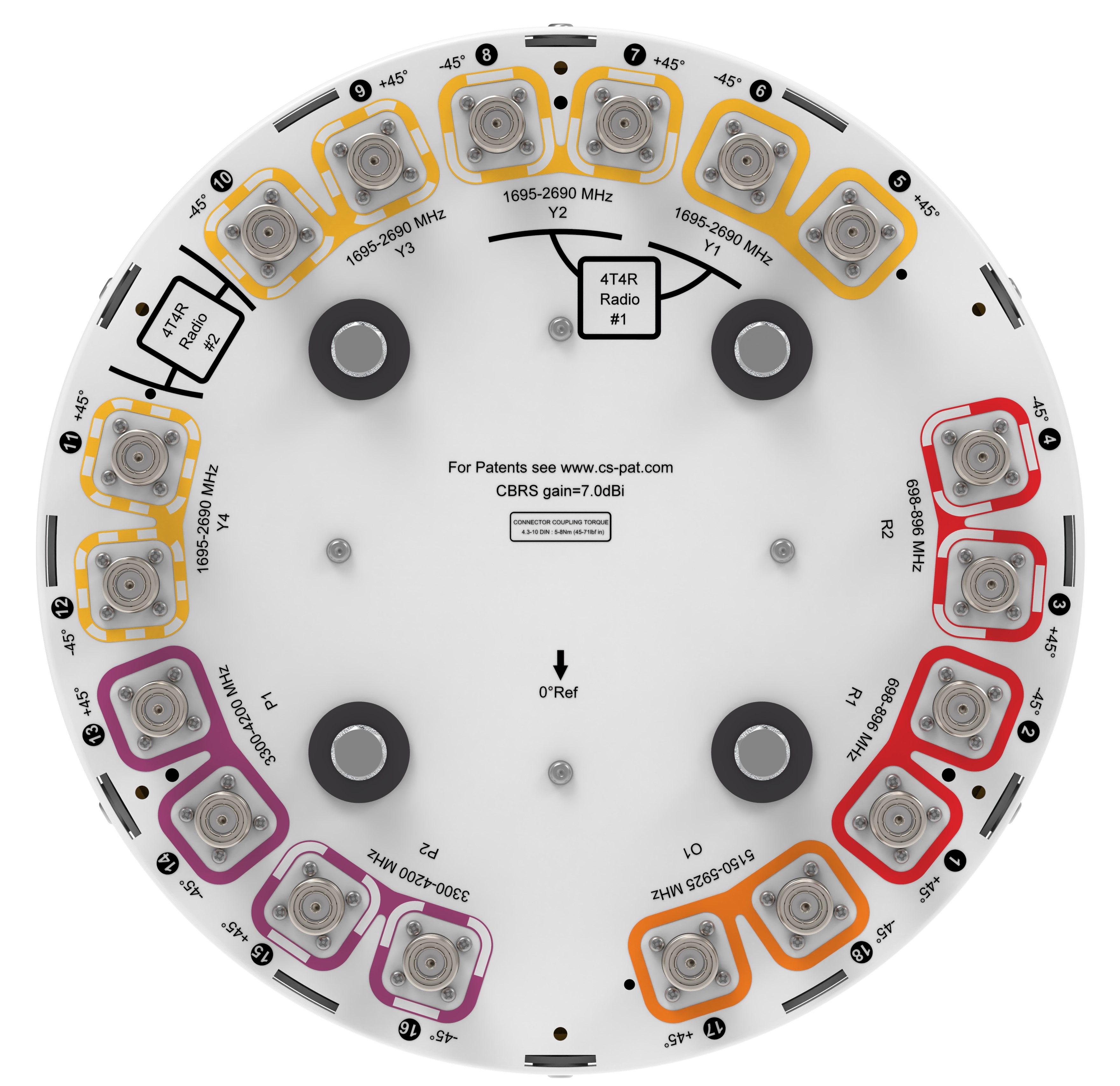 18-port small cell antenna, 4x 698-896, 8x 1695–2690, 4x 3300- 4200 and 2x 5150-5925 MHz, 360° Horizontal Beamwidth, fixed tilt.