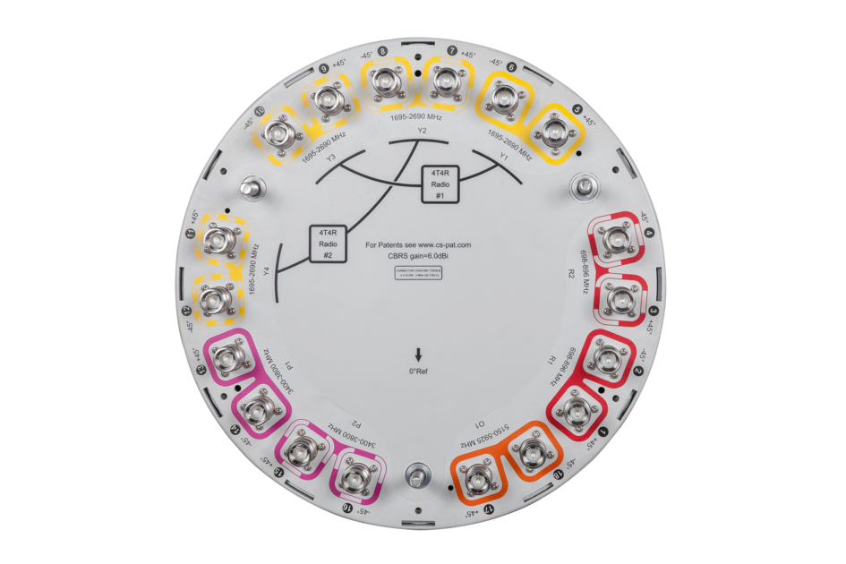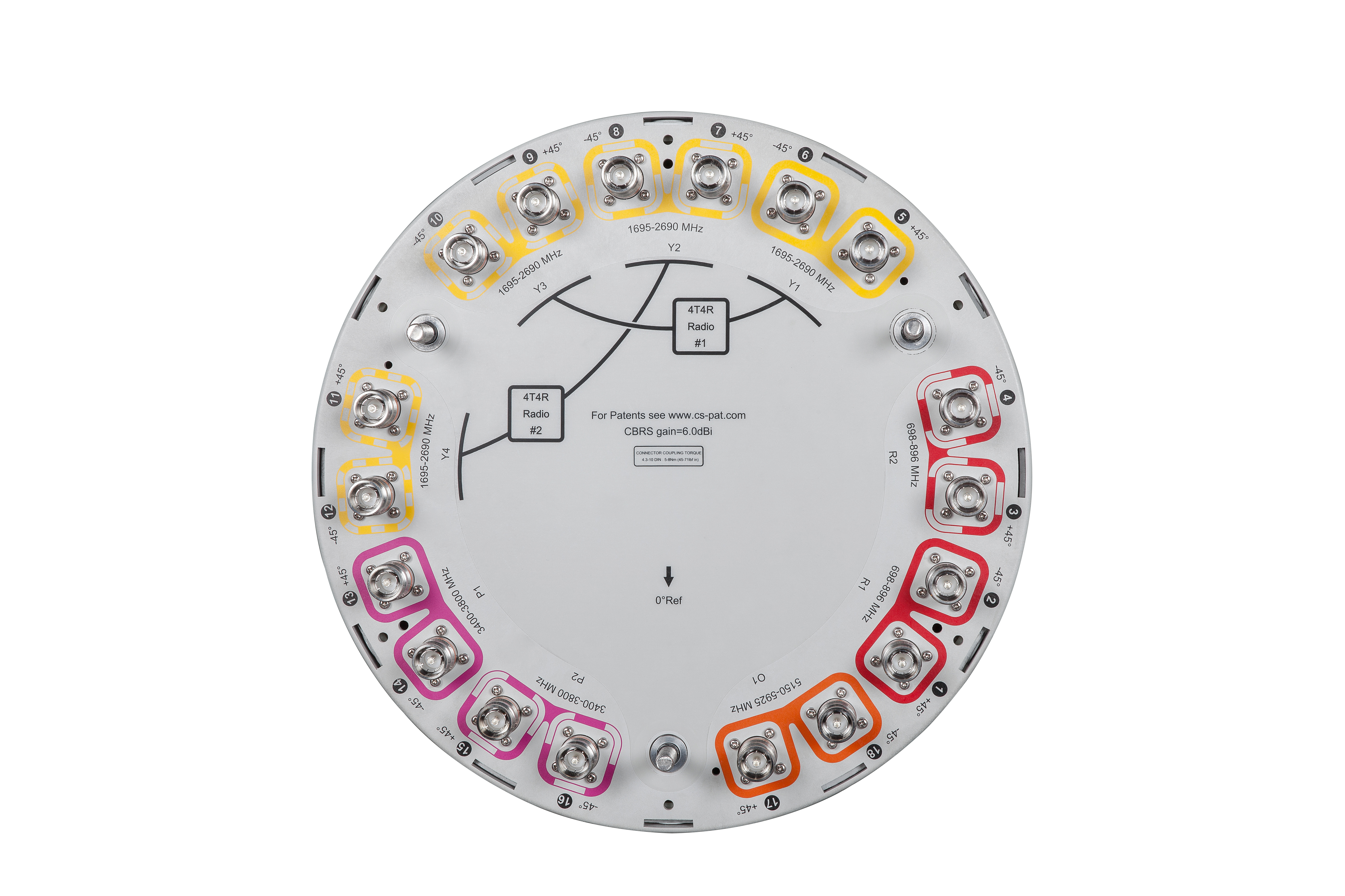 18-port small cell antenna, 4x 698-896, 8x 1695–2690, 4x 3400-3800 and 2x 5150-5925 MHz, 360° Horizontal Beamwidth, fixed tilt.