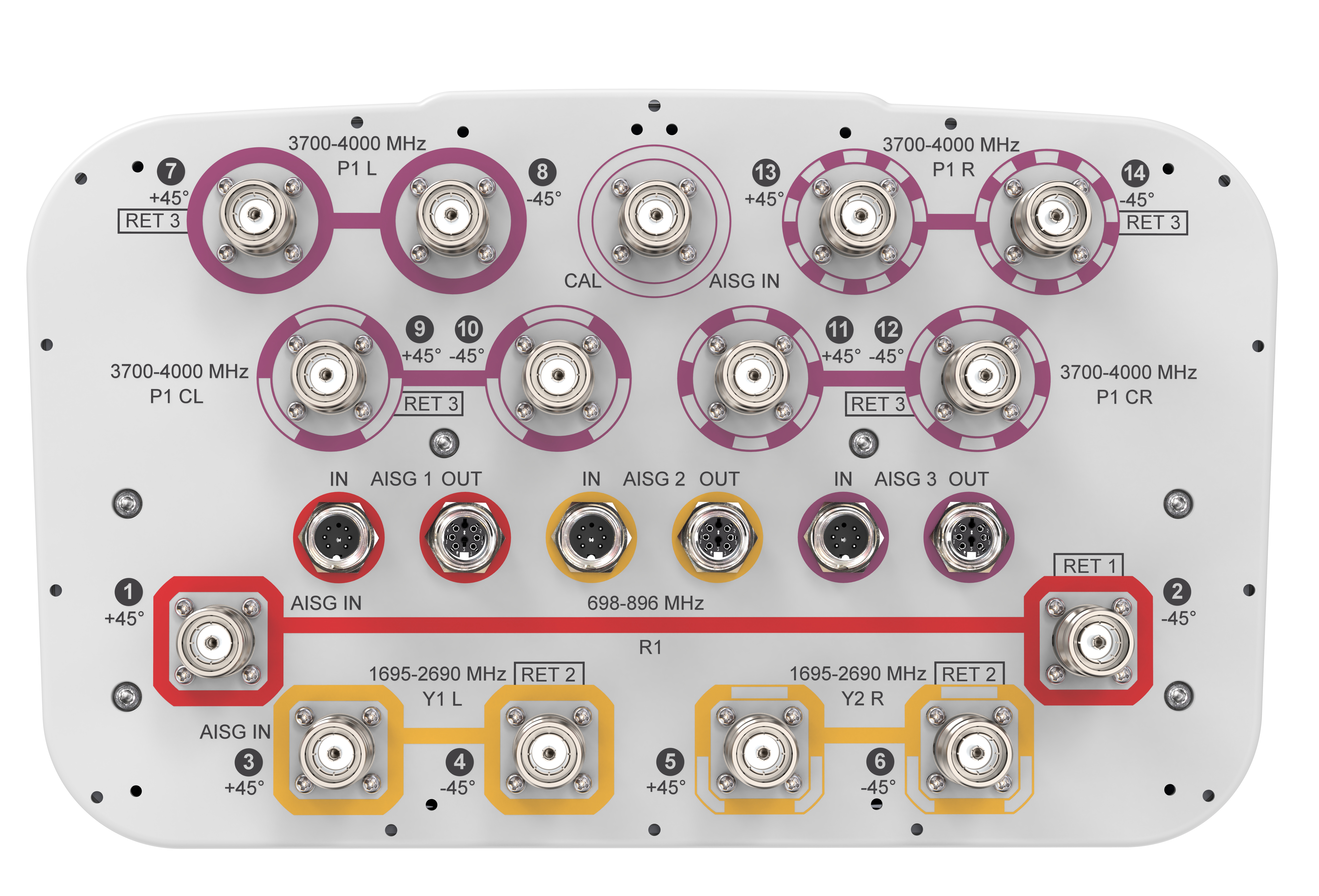 14 Port Sector Antenna, 2x698-896 MHz, 4x1695-2690 MHz 65° HPBW, and 8x3700-4000 MHz Beamformer, 3XRET and 3x SBTs