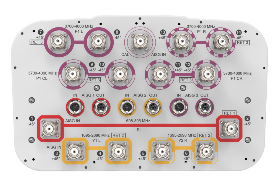 • One Low Band RET, One Mid Band RET and One High Band RET. Each RET controlled individually through internal SBTs