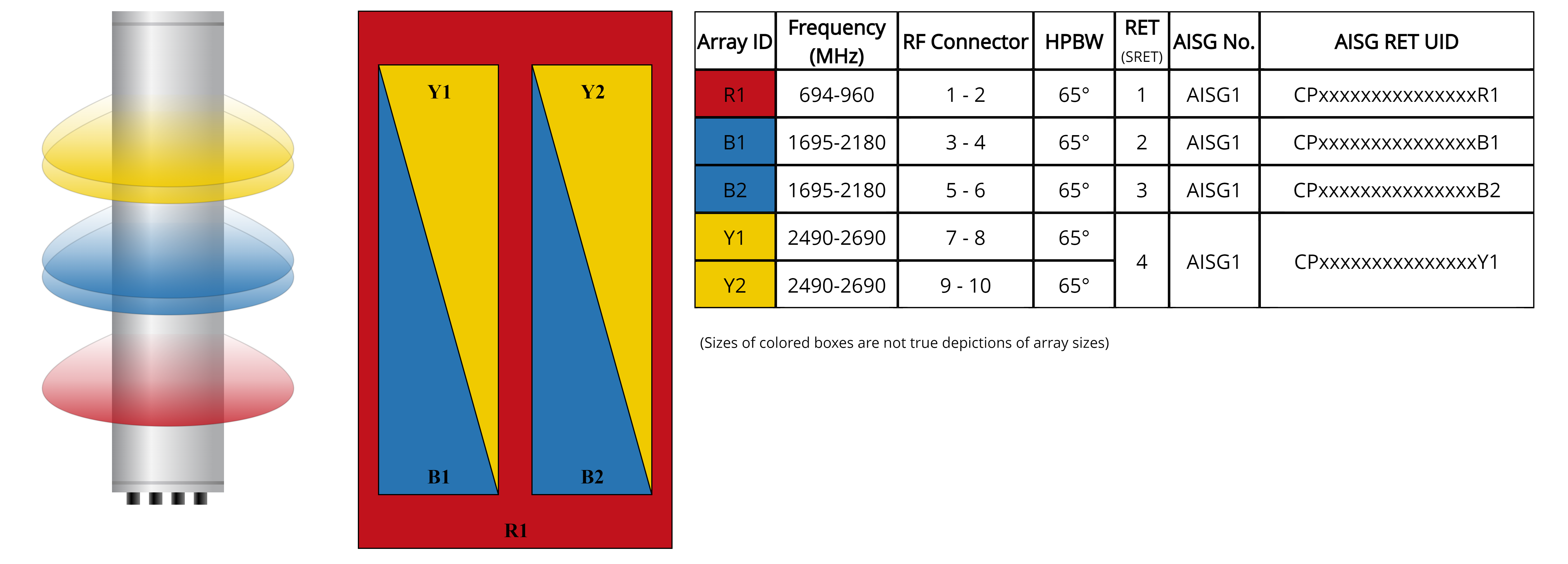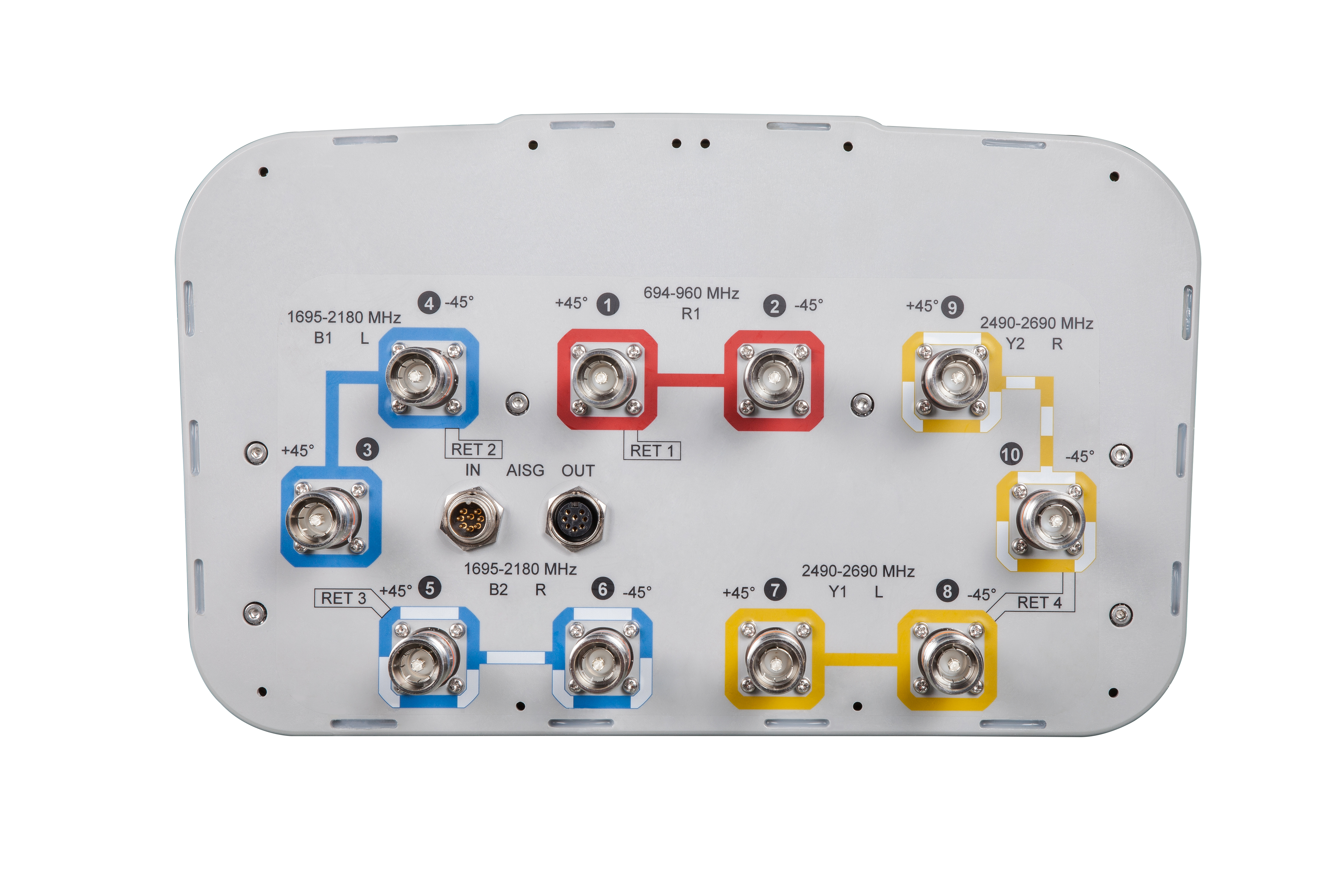 10-port sector antenna, 2x 694–960, 4x 1695–2180 and 4x 2490-2690 MHz, 65° HPBW, 4x RET. High bands (H1/H2) arrays are diplexed at the element level.