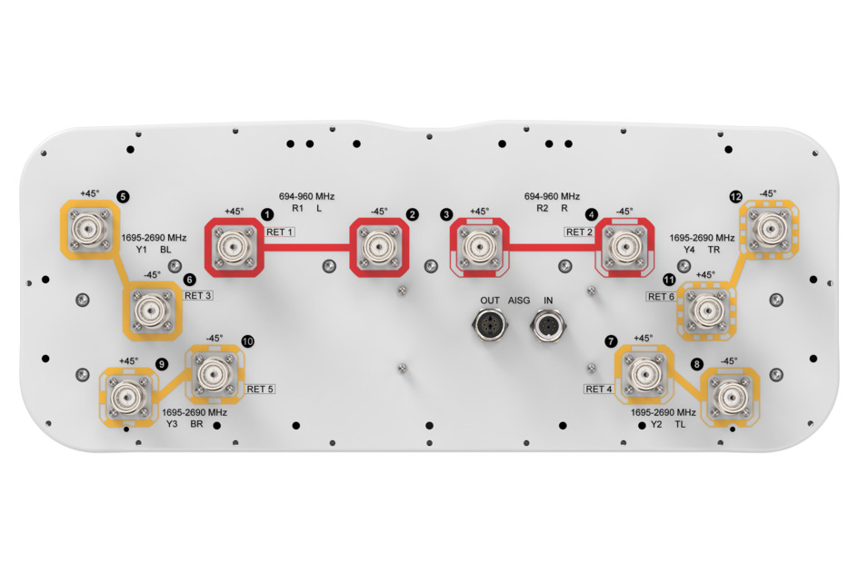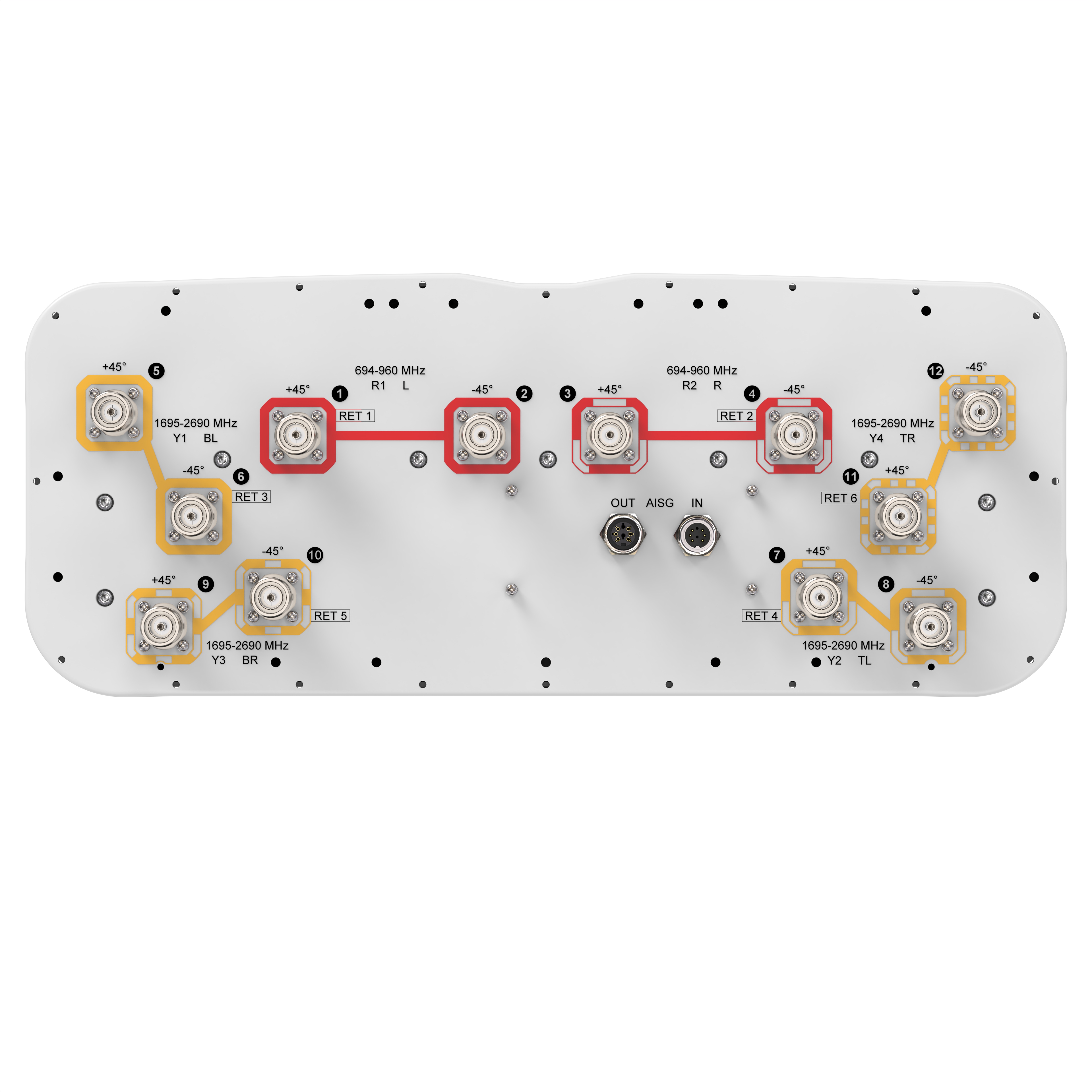 12-port sector antenna, 4x 698–960 and 8x 1695–2690 MHz, 65° HPBW, 6x IntRET. Bands cascaded SRET.
