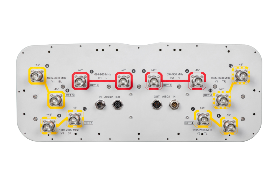12-port sector antenna, 4x 694–960 and 8x 1695–2690 MHz, 65° HPBW, 6x RET.