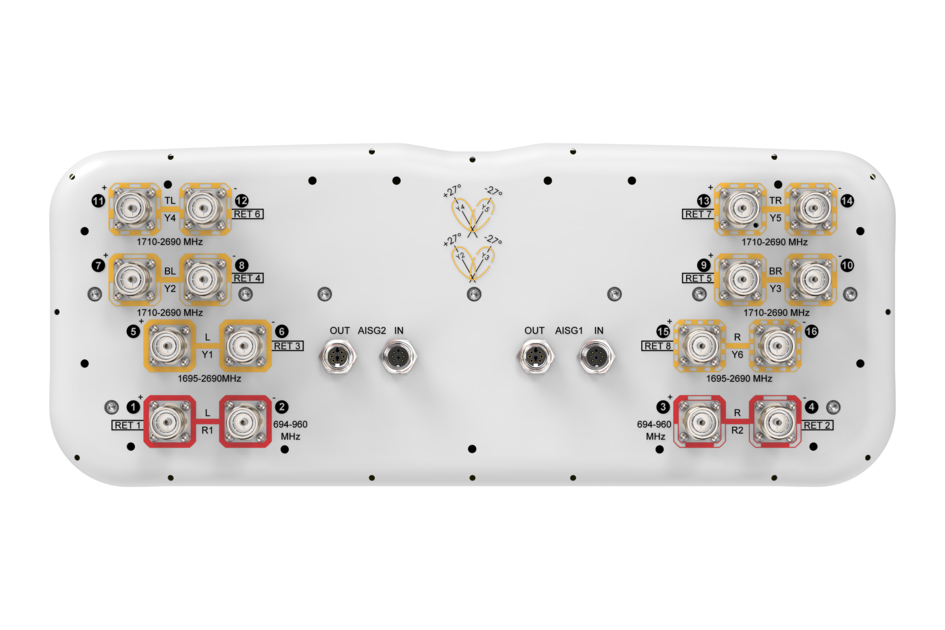 16-port sector/multibeam antenna 4x 694–960 MHz, 4x 1695-2690 MHz 65° HPBW and 8x 1710–2690 MHz 2x 2-Beam 33°HPBW, 8x RET
