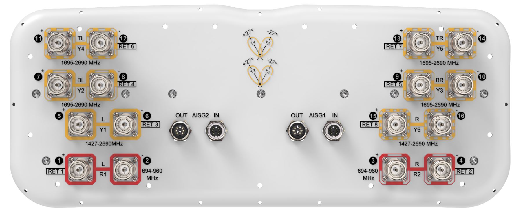 16-port sector/multibeam antenna 4x 694–960 MHz, 4x 1427-2690 MHz 65° HPBW and 8x 1695–2690 MHz 2x 2-Beam 33°HPBW, 8x RET