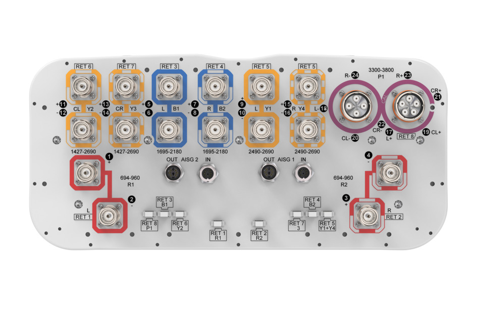 24-port sector antenna, 4x 694-960, 4x 1427-2690, 4x 1695-2180, 4x 2490-2690 and 8x 3300-3800 MHz, 65° HPBW, 8x RET
