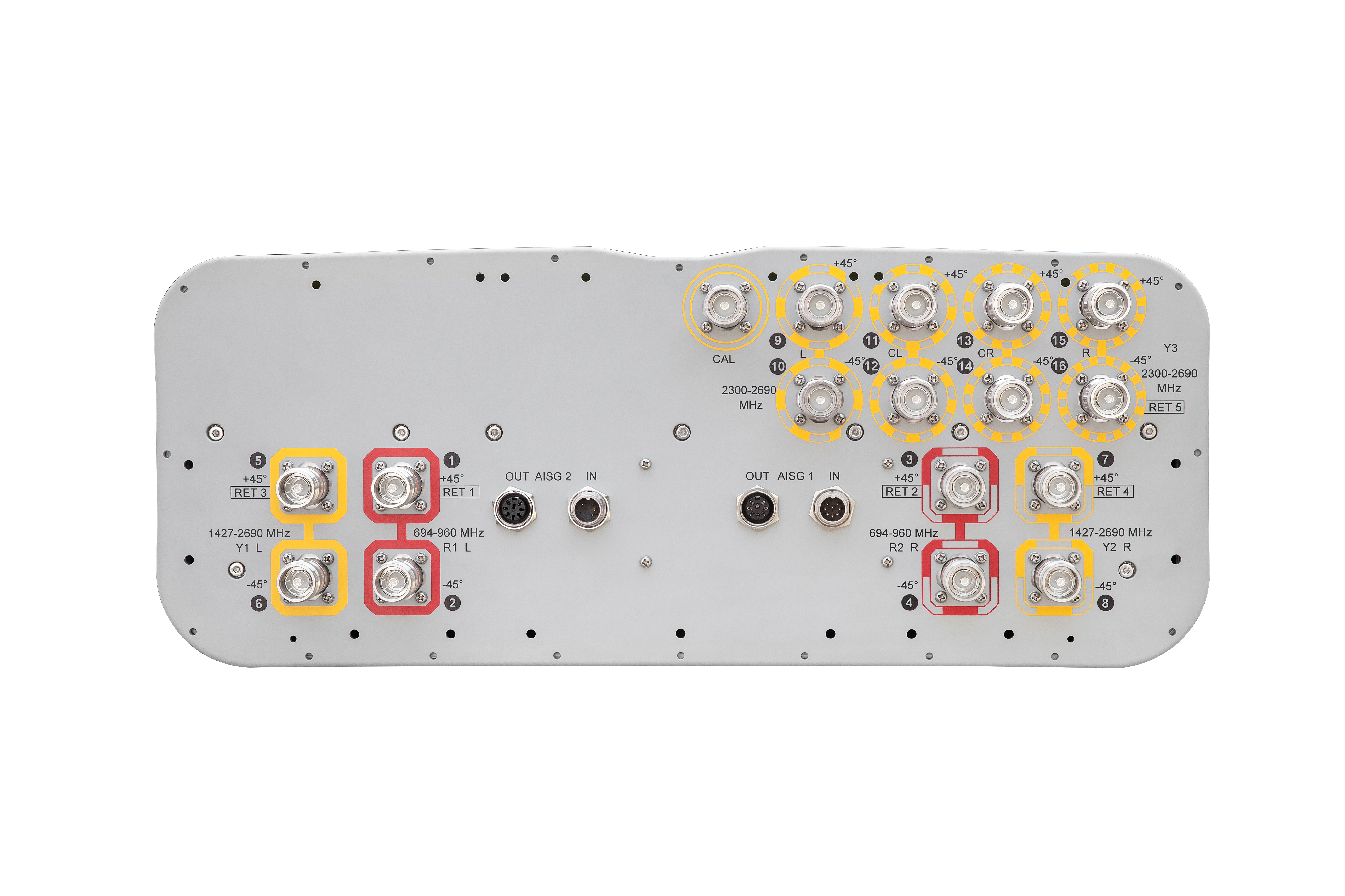 16-port sector antenna, 4x 694–960, 4x 1427-2690 MHz 65° HPBW and 8x 2300–2690 MHz, 90° HPBW, 5x RET