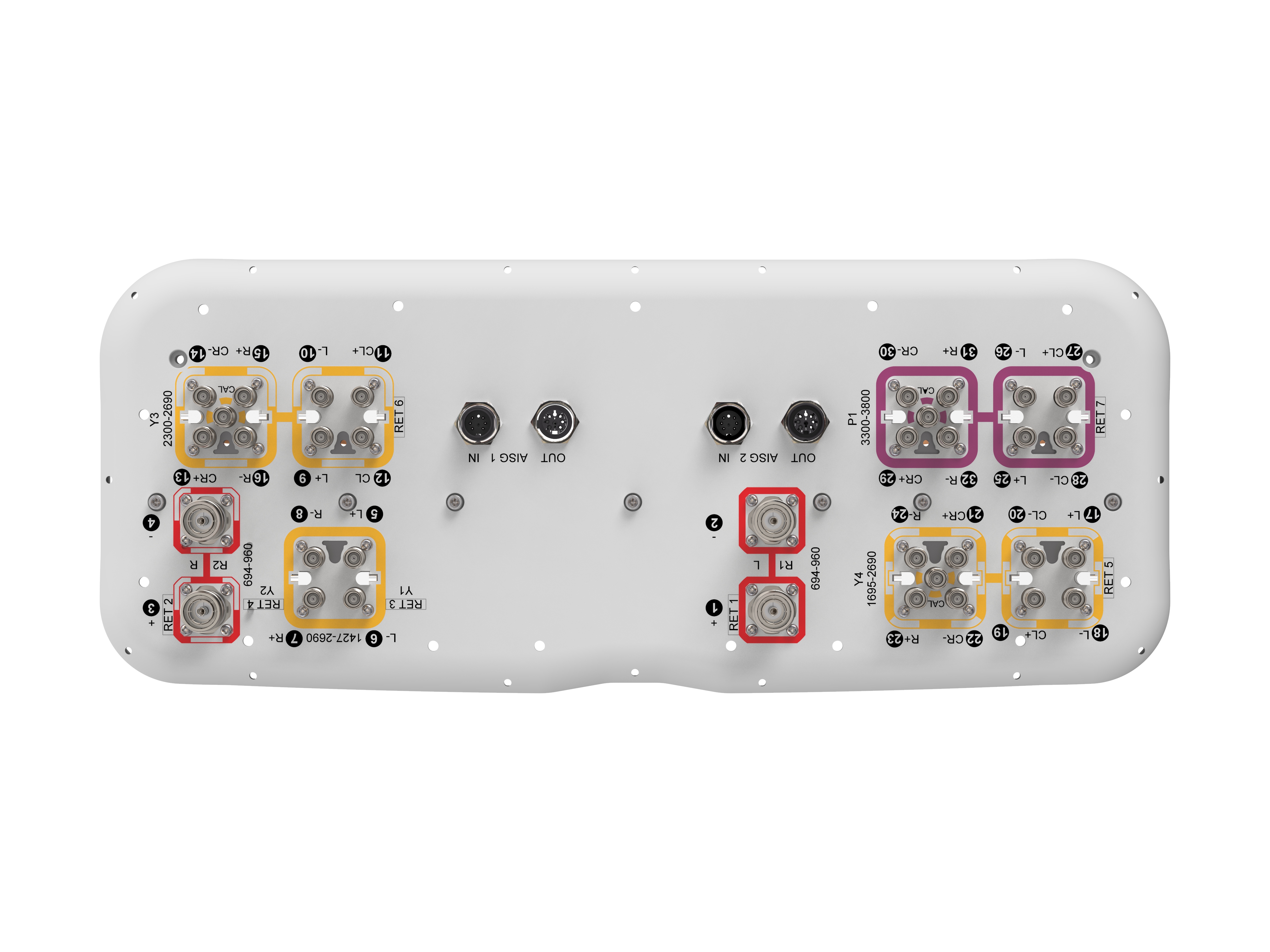 32-port sector antenna, 4x 694-960 and 4x 1427-2690 MHz 65° HPBW, 8x 1695-2690, 8x 2300-2690 and 8x 3300-3800MHz, 90° HPBW, 7x RET