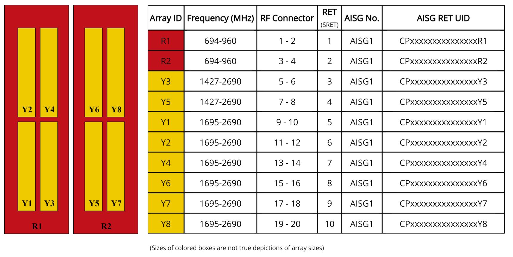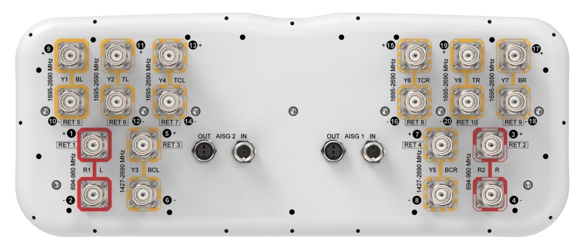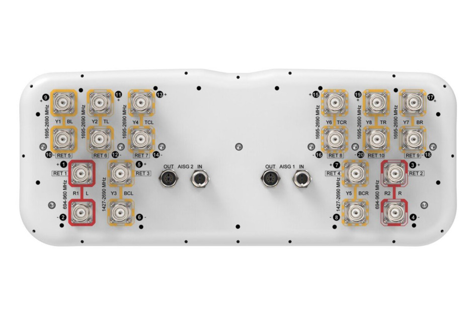 20-port sector antenna, 4x694-960 (R1 & R2), 4x1427-2690 (Y3 & Y5) and 12 x 1695-2690 MHz (Y1/Y2/Y4/Y6/Y7/Y8), 65° HPBW, 10xRET