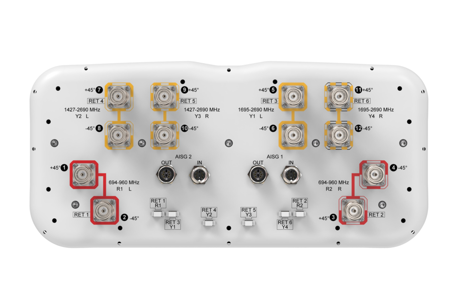 12-port sector antenna, 4x 694–960, 4x 1427–2690 and 4x 1695-2690 MHz, 65° HPBW, 6x RET