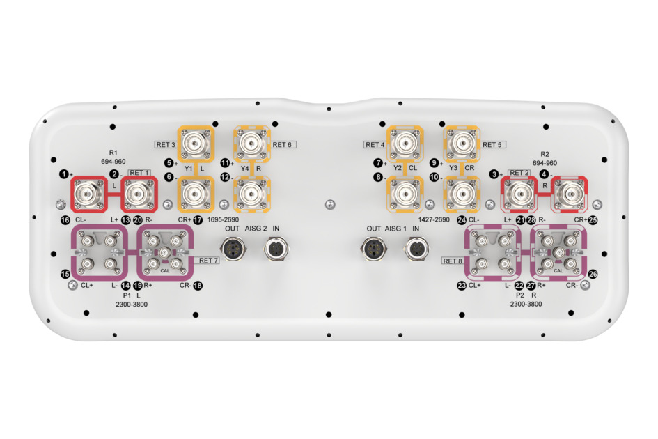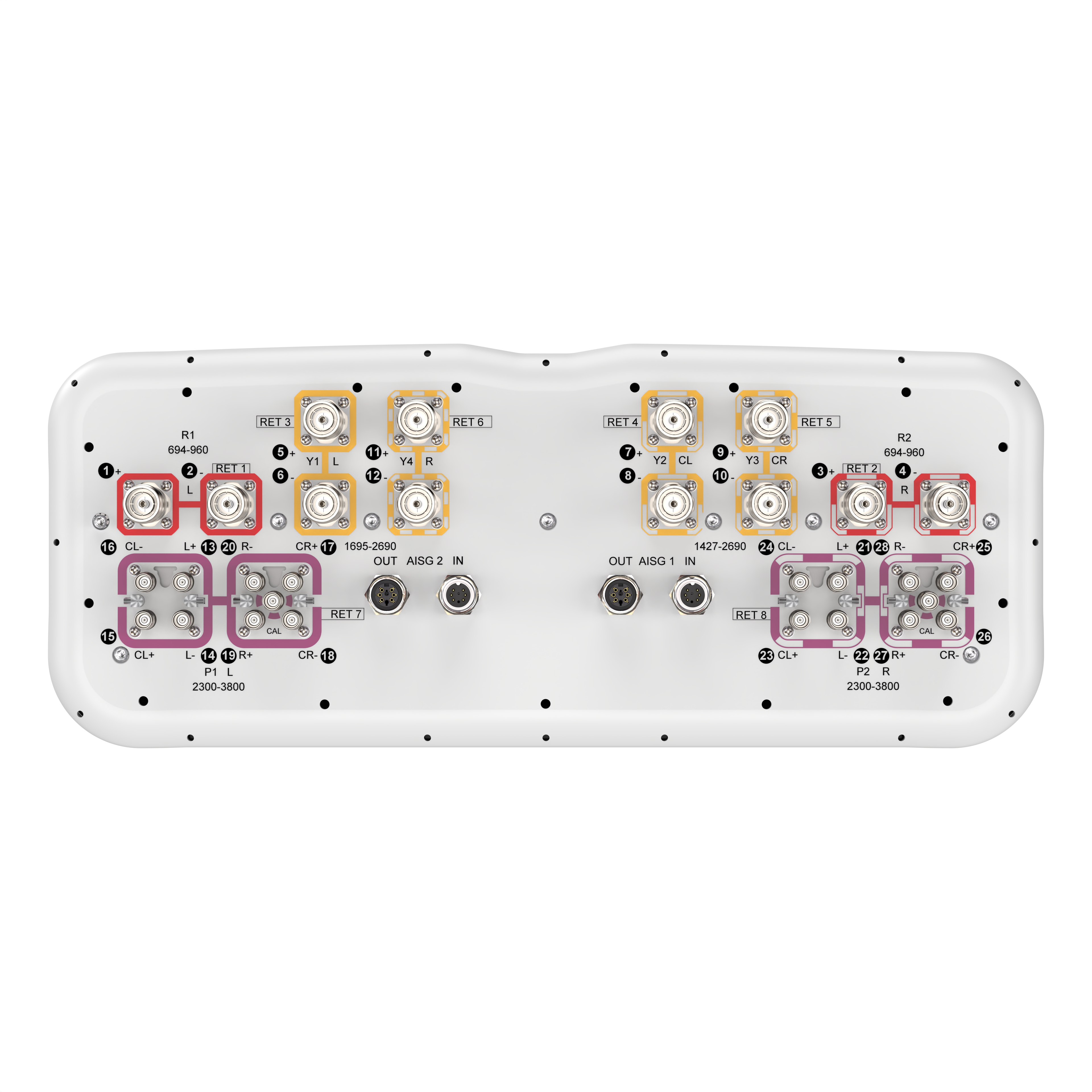 28-port sector antenna,4 x 694-960 MHz (R1,R2), 4 x 1695-2690 MHz (Y1,Y4) and 4 x 1427-2690 MHz (Y2,Y3) , 65° HPBW, 16 x 2300-3800 MHz (P1,P2), 90° HPBW, 8 x RET
