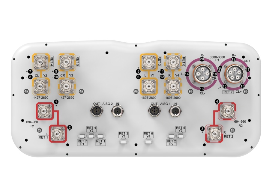 20-port sector antenna, 4x 694-960, 4x 1427-2690, 4x 1695-2690 MHz, 65° HPBW and 8x 3300-3800 MHz, 90° HPBW, 7x RET.