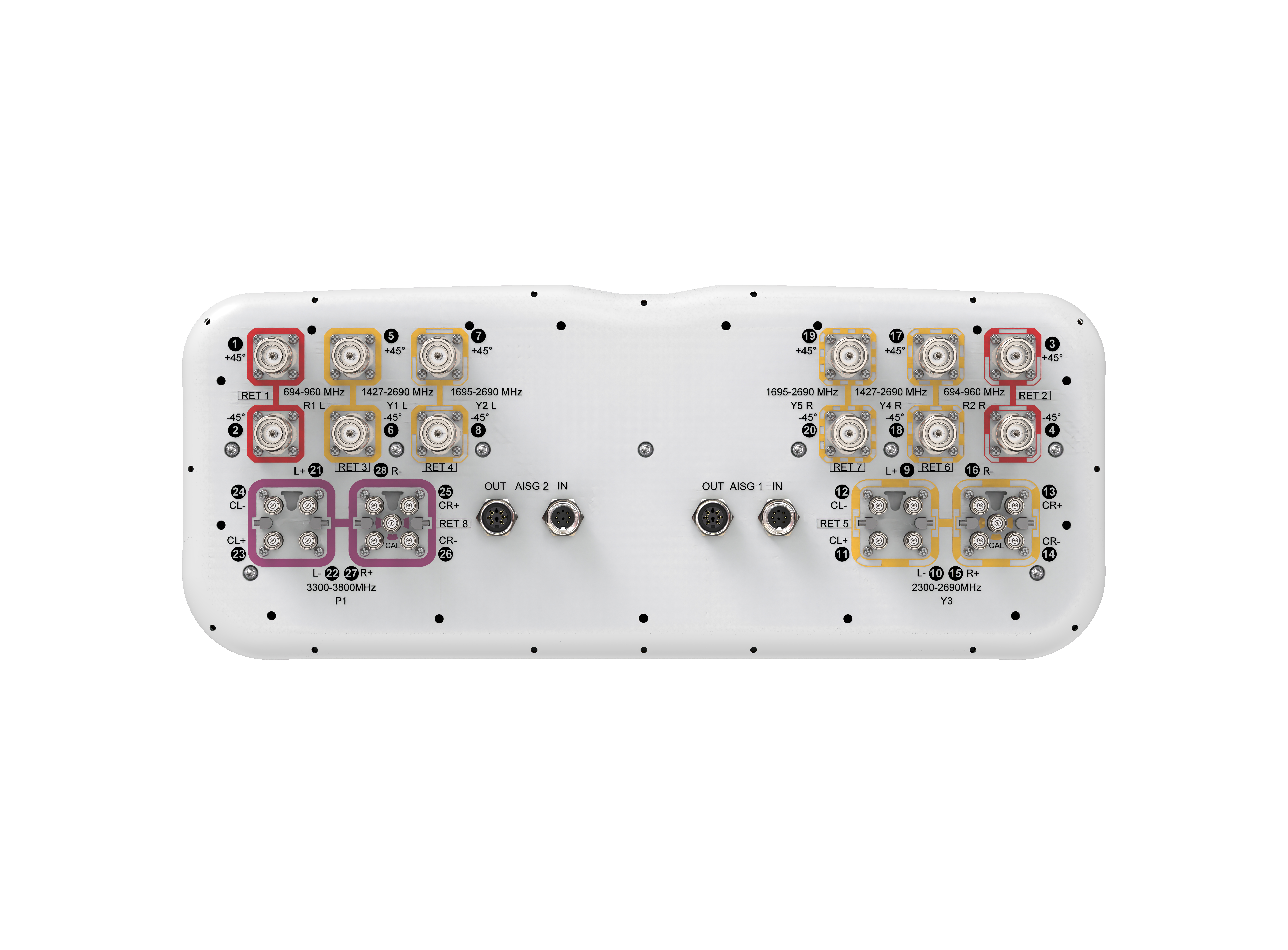 - Also includes 1x 4-Column Array for 2300-2690 MHz and a separate 1x 4-Column Array for 3300-3800MHz. Column spacing optimized to support Soft Split Beamforming