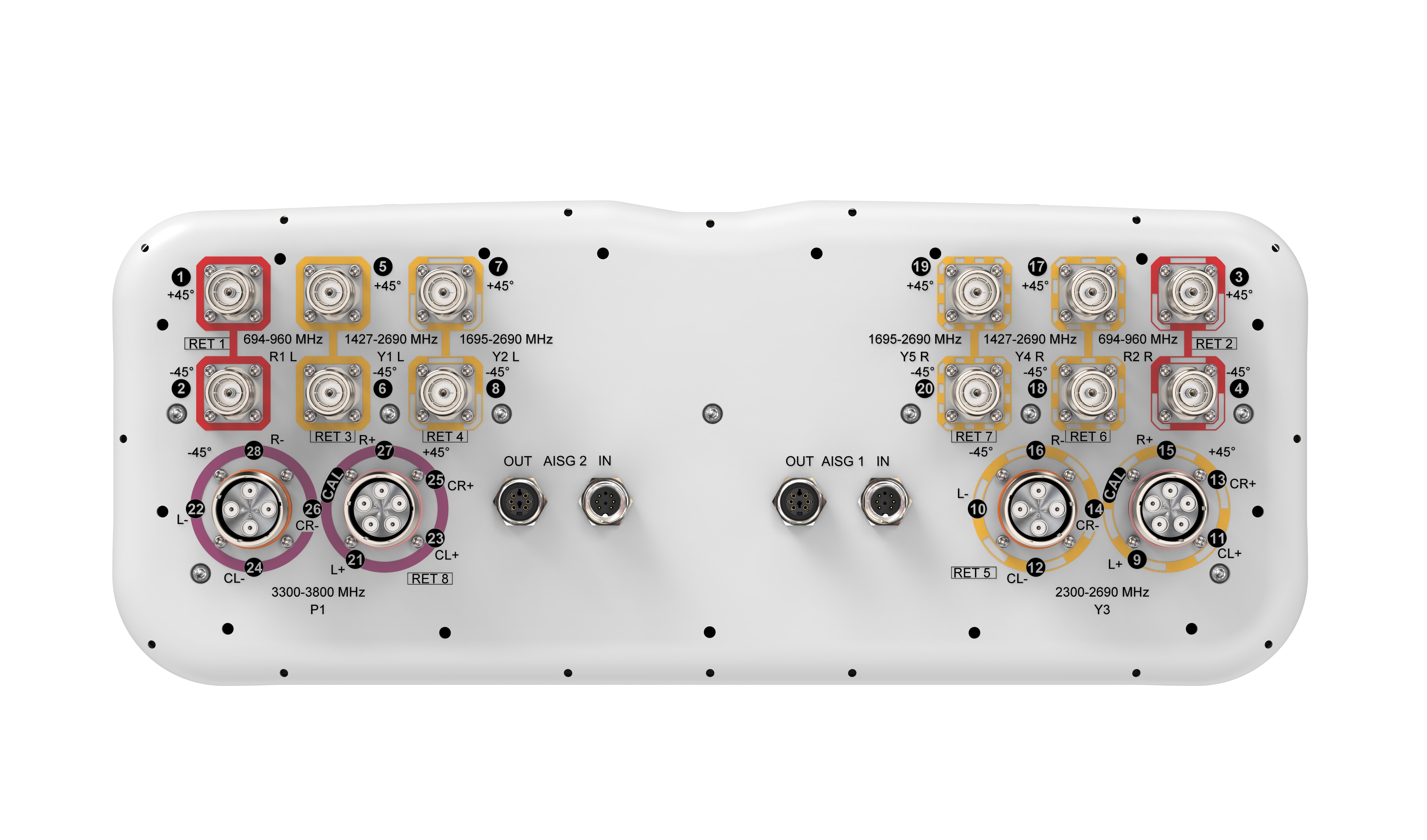 • Also includes 1x 4-Column Array for 2300-2690 MHz and a separate 1x 4-Column Array for 3300-3800MHz. Column spacing optimized to support Soft Split Beamforming
