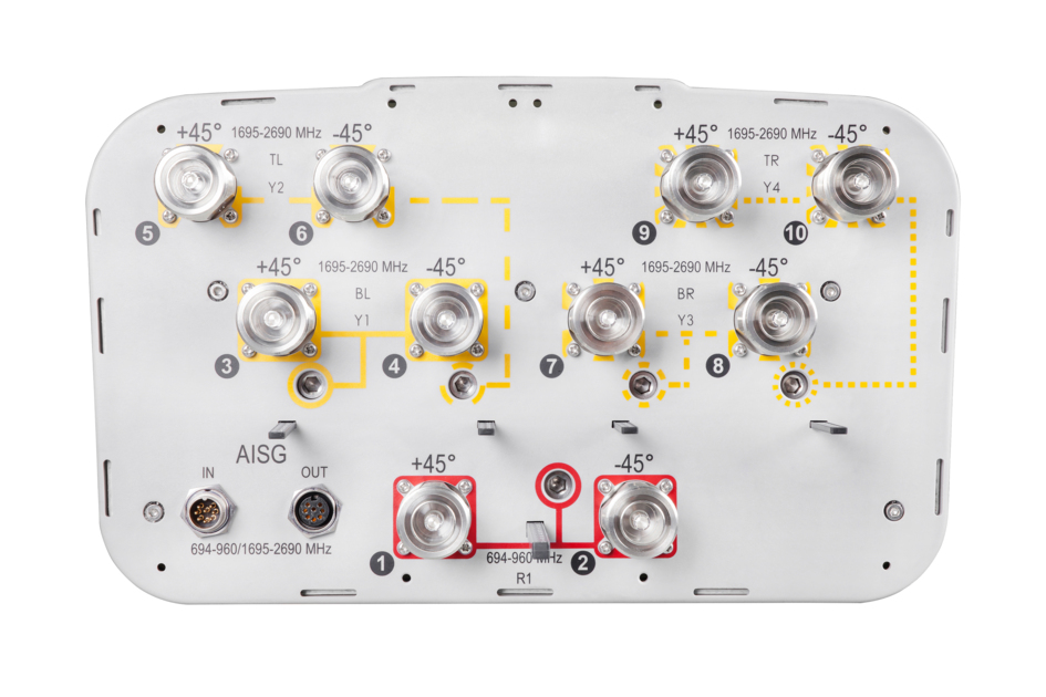 10-port sector antenna, 2x 694–960 and 8x 1695–2690 MHz, 65° HPBW, 5x RET with manual override. Bands cascaded SRET.