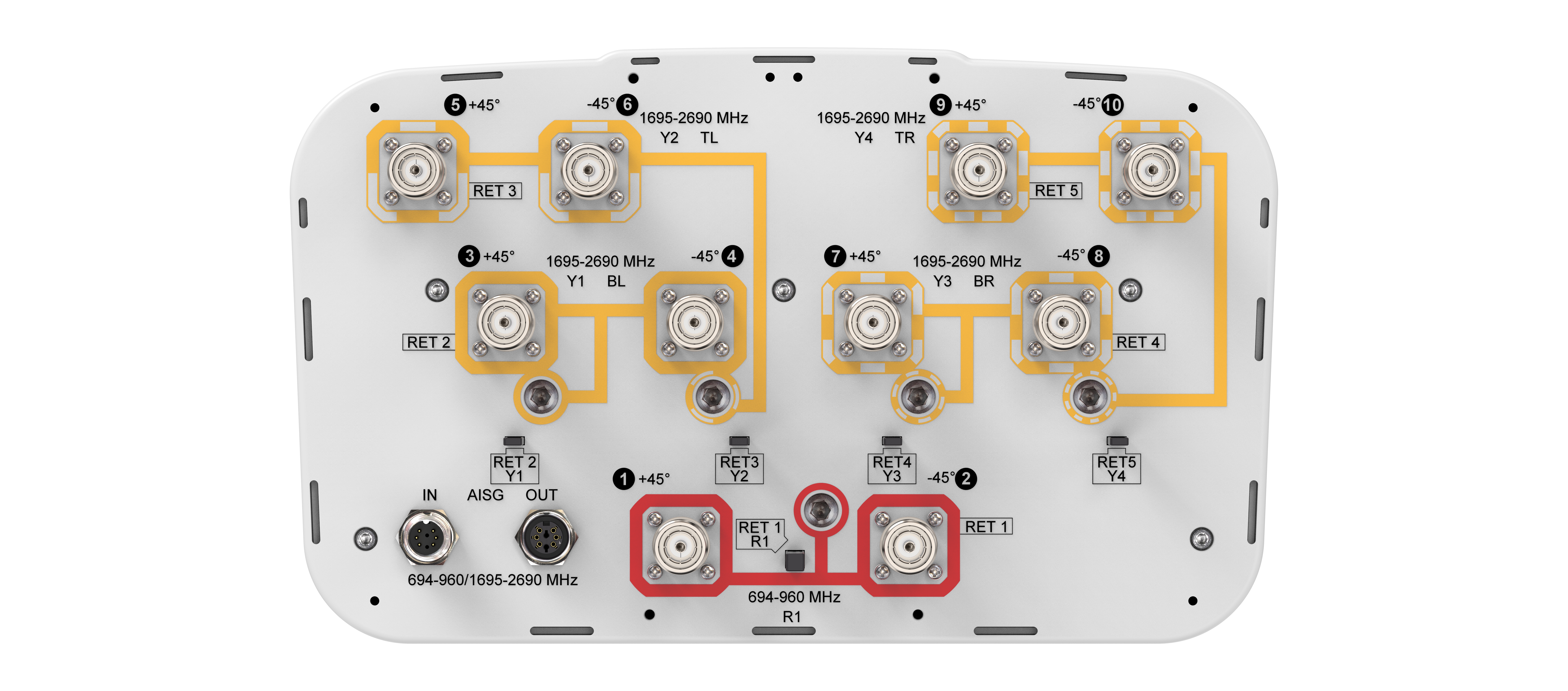 10-port sector antenna, 2x 694–960 and 8x 1695–2690 MHz, 65° HPBW, 5x RET with manual override. Bands cascaded SRET.