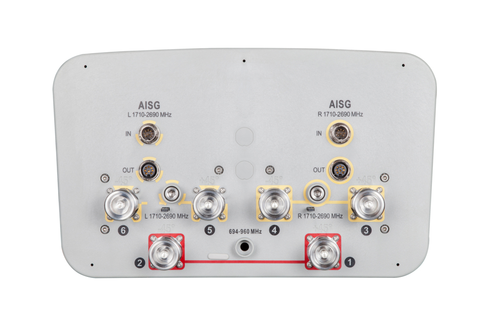6-port sector antenna, 2x 694–960 and 4x 1710–2690 MHz, 65° HPBW, fixed electrical tilt (12°) low band, 2x RET on both high band arrays with a separate pair of AISG Input and Output ports per array.