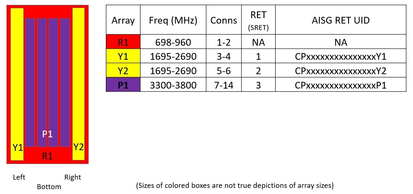 14-port sector antenna, 2x 698-960(R1), 4x 1695-2690(Y1&Y2) MHz, 65° HPBW and 8x 3300-3800(P1) MHz, 90° HPBW, 4x RET.
