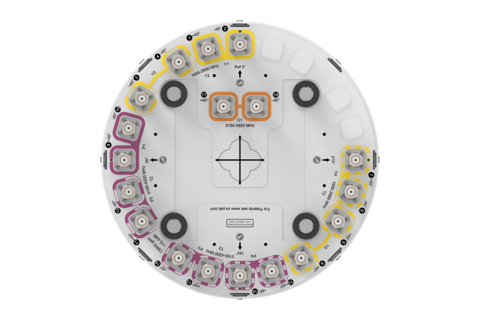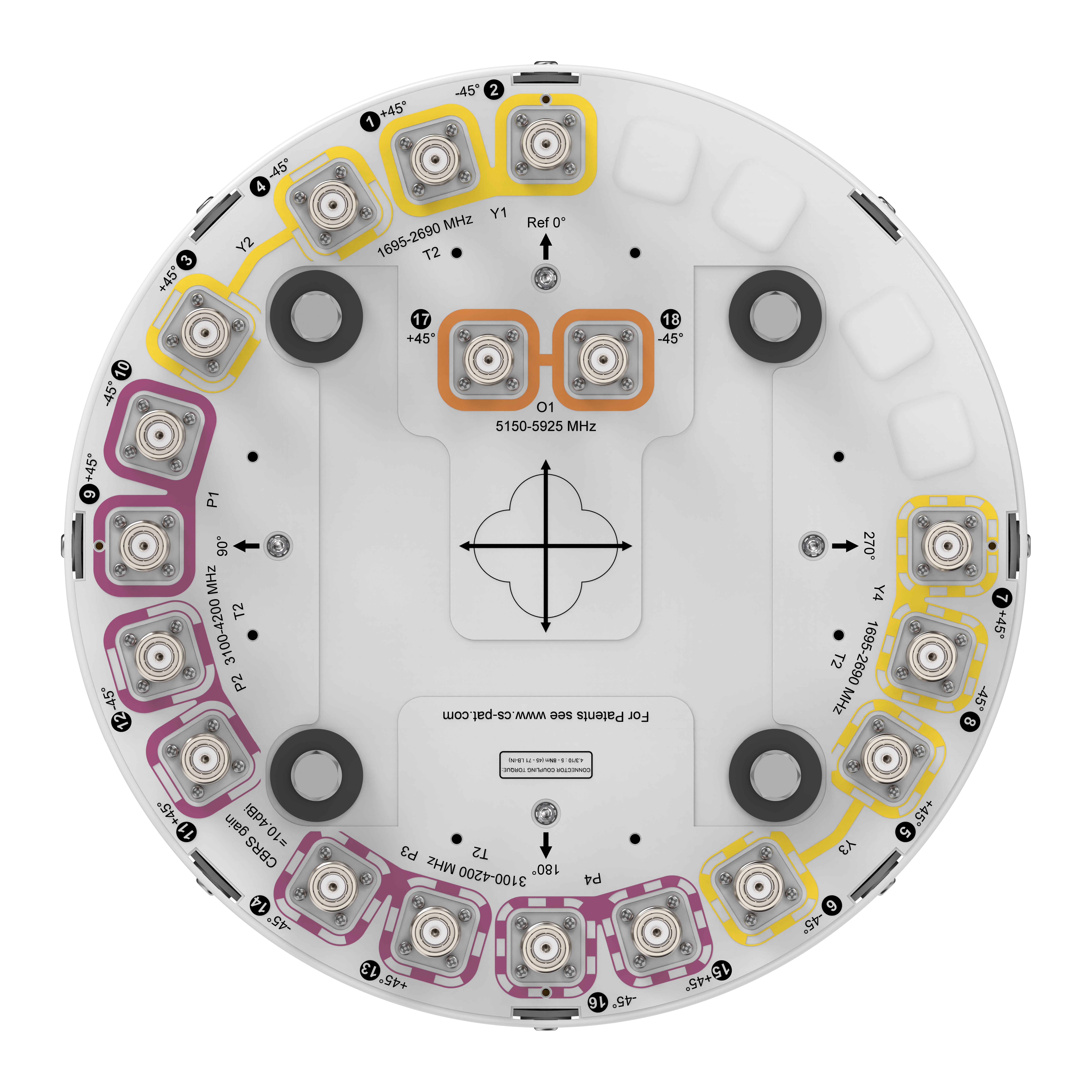 18-port small cell antenna, 8x 1695-2690, 8x 3100- 4200,2x 5150-5925 MHz, 360° Horizontal Beamwidth, fixed tilt.