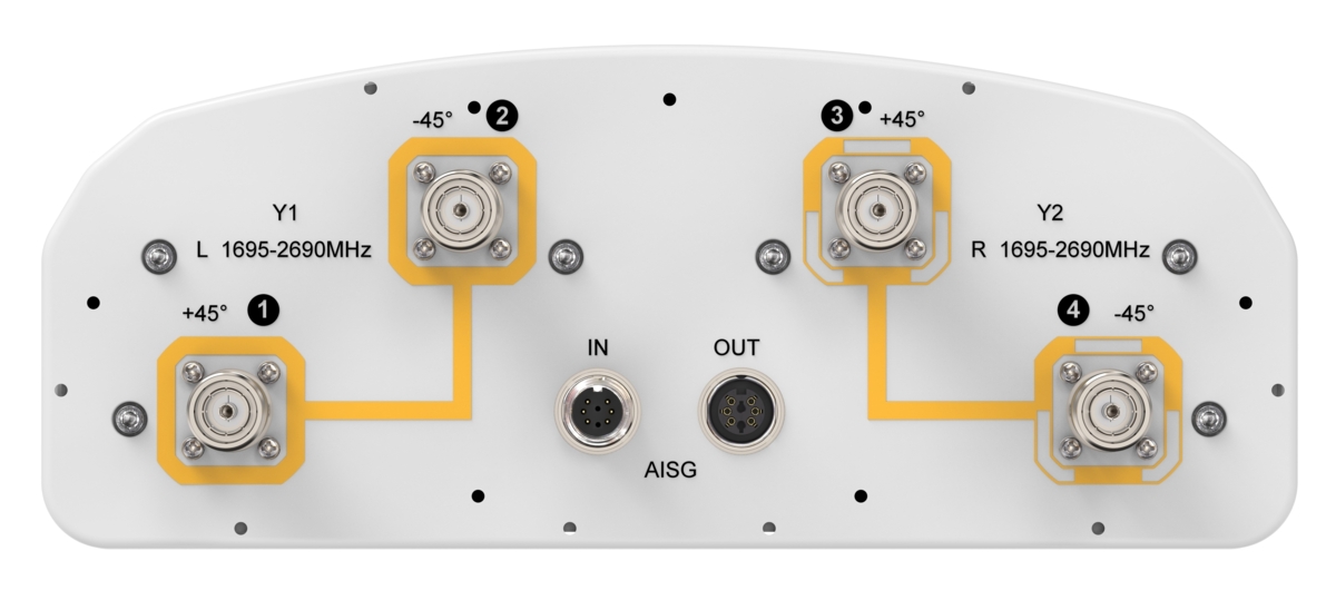 4-port sector antenna, 4x 1695–2690 MHz, 65° HPBW, 1x RET . The two high band arrays utilize a common tilt.