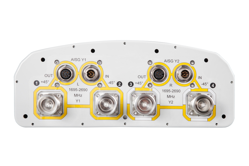 4-port sector antenna, 4x 1695–2690 MHz, 65° HPBW, 2x RET. Two pairs of AISG Input and Output ports to separately and independently control the RET on each array for operator sharing applications.