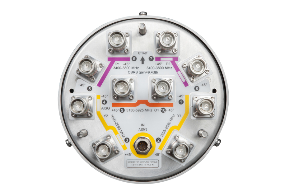 10-port small cell antenna, 4x 1695–2690, 4x 3400-3800 and 2x 5150-5925 MHz. 65° HPBW, Internal RET and SBT