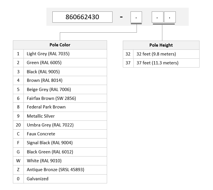 | Pole Height Options | 9.754 m | 32 ft | 11.278 m | 37 ft |