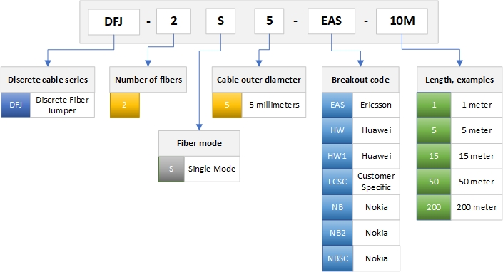 HELIAX® Discrete, 2 single mode fiber, 5 mm LSZH cable. End 1: DLC. End 2: DLC Breakout length: end one, 72mm. Breakout length: end two, 382mm.