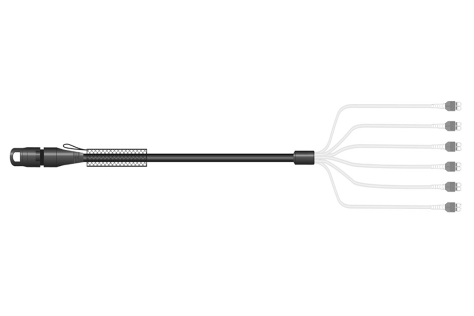 HELIAX® Discrete, outdoor rated, single mode 12 fiber cable assembly, End 1: OptiTip Compaitble connector (Jack) and End 2: Uniboot DLC. End 2 branch..