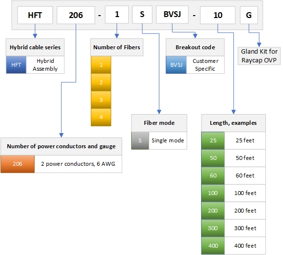 HELIAX® Hybrid Cable Assembly, 6-OVP box to RRU, Power Cord to RRU UR Type TC-ER, 2 Power conductors 6 AWG RRU, 6 AWG OVP, 2 fiber Bi-Di Jonhon adapter compatible pvc jacket aluminum armor, OVP gland insert kit included