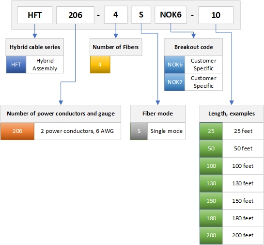 HELIAX® Hybrid Cable Assembly. HQLC End 1: 4 fibers DLC for Nokia AirScale RRUs, R2CT with power connector pre-installed (red / black conductors). End 2: 4 fibers terminated LC and 2 X 6 AWG conductors terminated at hybrid trunk connector