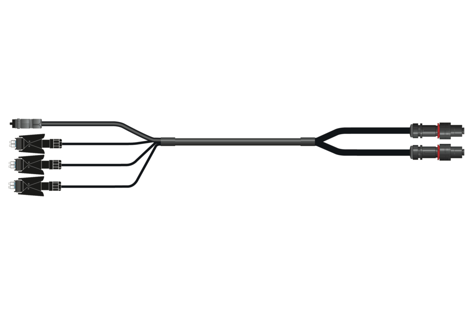 HELIAX® Hybrid Cable Assembly. End 1: six fibers within three DLC with AOPC shroud and one pair 6AWG power cord with connector installed. End two: Y- split with two IP-25 hybrid connectors.