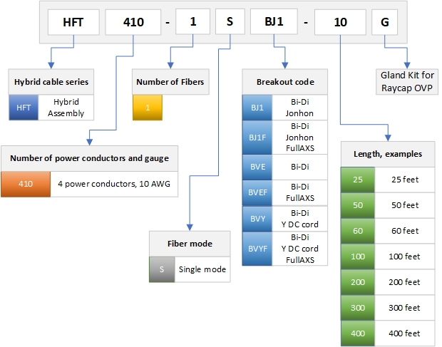HELIAX® Hybrid Cable Assembly, 6-OVP box to RRU, Power Cord to RRU, UL Type TC-ER, 4 power conductors 8 AWG RRU, 10 AWG BBU, 1-fiber, Bi-Di, Jonhon Adapter Compatible, PVC jacket, aluminum armor, OVP gland insert kit included