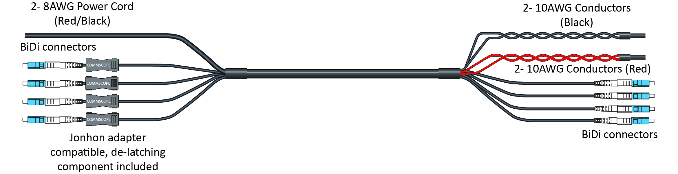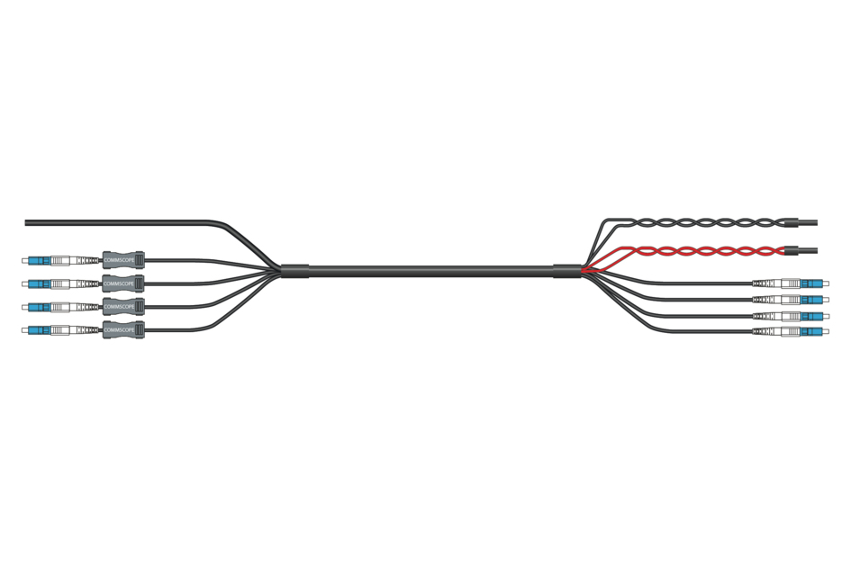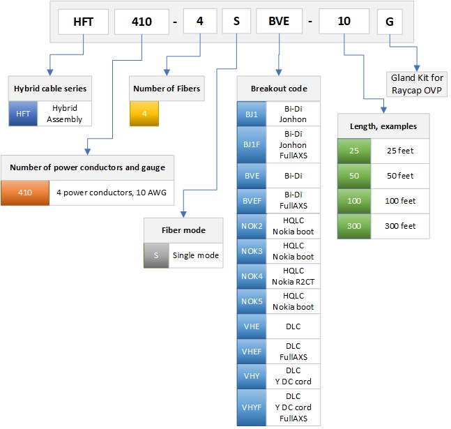 HELIAX® Hybrid Cable Assembly, 6-OVP box to RRU, Power Cord to RRU, UL Type TC-ER, 4 power conductors 8 AWG RRU, 10 AWG BBU, 4-fiber, Bi-Di, Jonhon Adapter Compatible, PVC jacket, aluminum armor, OVP gland insert kit included