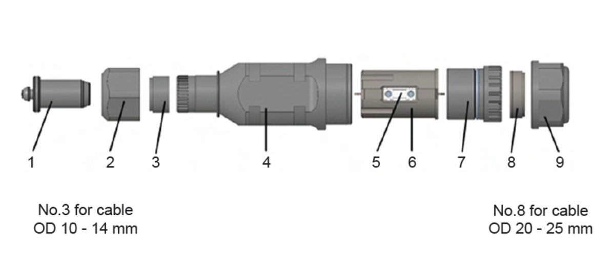HELIAX® power adaptor, 2 Core DC Power Cable connection. Input Power Cable conductor size as 2.5mm2~25mm2 and Output Power Cable conductor size as 2.5mm2~16mm2. Shield contact size as 4~6mm2. Glands at both ends providing a IP67 weatherproof performance