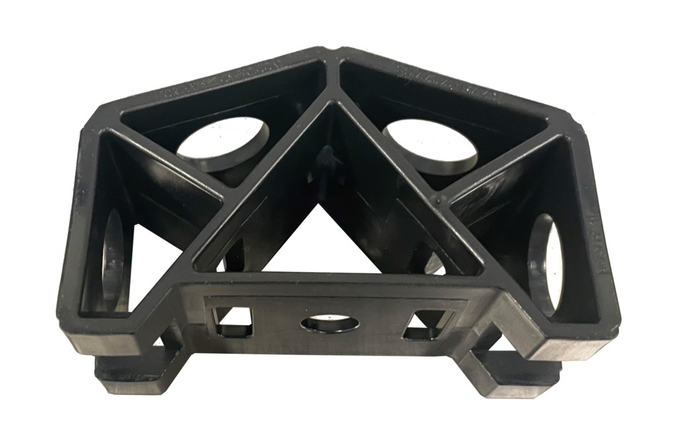 PIM-Guard® Four-Way Snap-in Stand-off Adapter has two slots for round member attachment and 3/8" holes for angle adapter integration. It includes four 3/4" holes for Snap-in hangers, supporting three 4-30mm or two 36-42mm cable stacks per hole