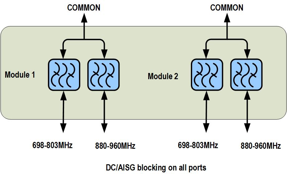 | dc/AISG Pass-through, combiner | dc/AISG blocking on all ports |